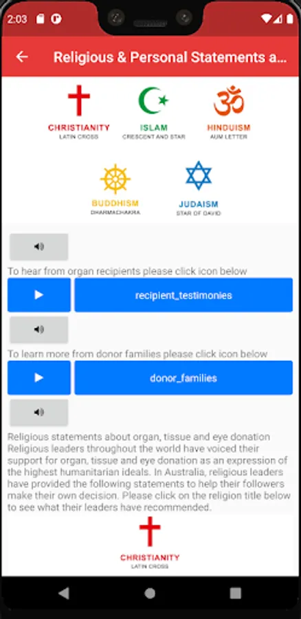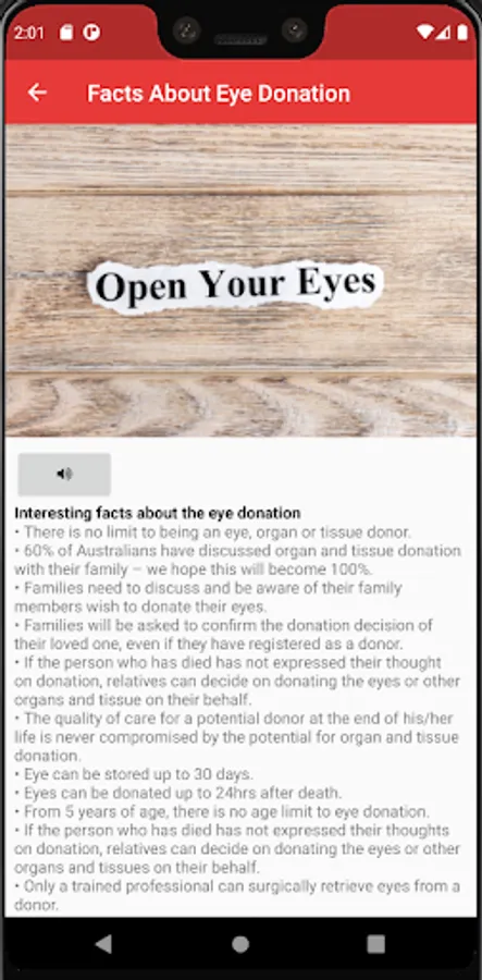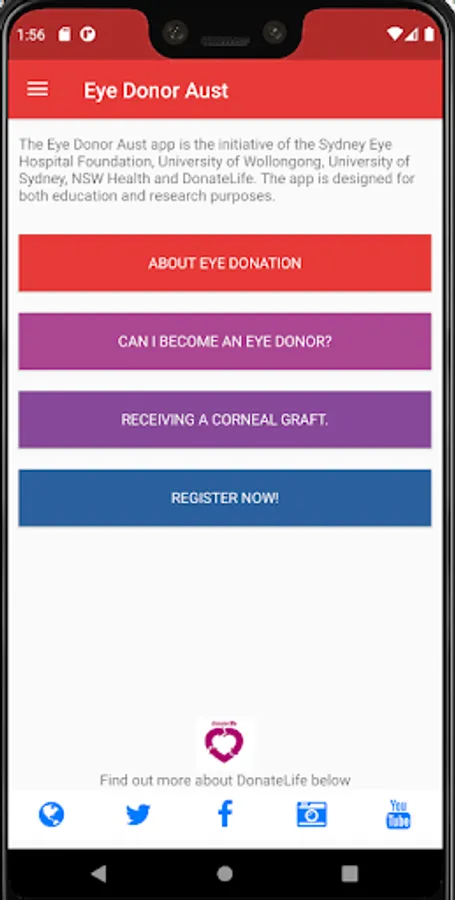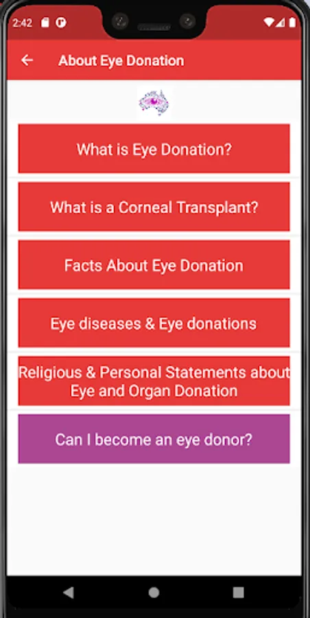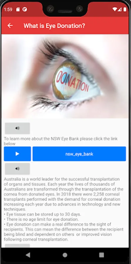 Our Eye Donor Aust app has an easy to navigate home page to explain about eye donation in Australia. This app has been developed by the NSW Tissue Banks (Lions NSW Eye Bank), Organ and Tissue Authority, University of Sydney and Wollongong and the Sydney Eye Hospital foundation. We aim to encourage and educate all Australians about the importance of eye and organ donation and discussing ones decision with their family. The app has patient testimonials and current information to allow people to help make an informed decision. The app has sub sections titled: (Eye donation, Can I become an eye donor, Facts about eye donation and I am/will be a corneal graft recipient) We hope you find this app useful and it helps promote the decision to save another person’s sight or life.