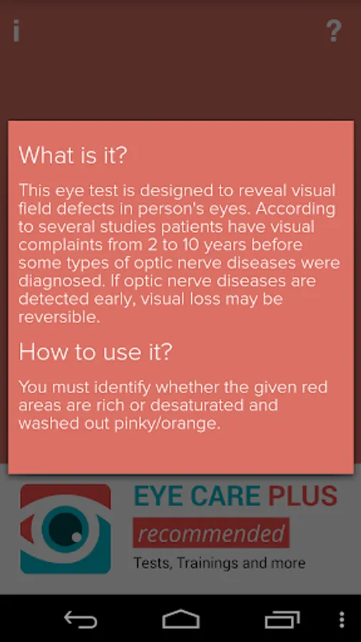 In the test one should identify if the given red areas have the same rich red color or the colors appear more desatured pink or orange. At the end of the test results will show whether the person may have neurological visual field defects or not for each eye separately.