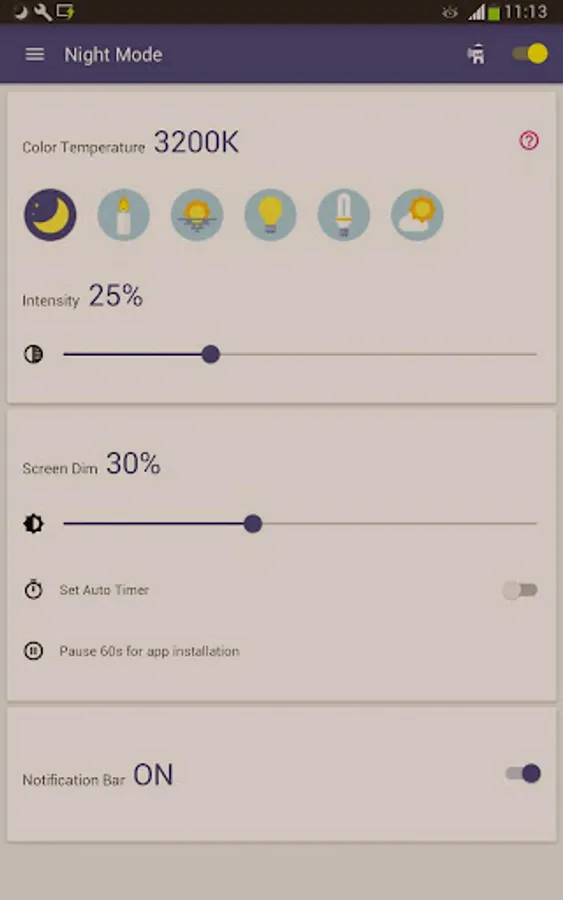 Handy buttons and auto timer will help you turn on and turn off the app in one second. Very useful app for eye care.