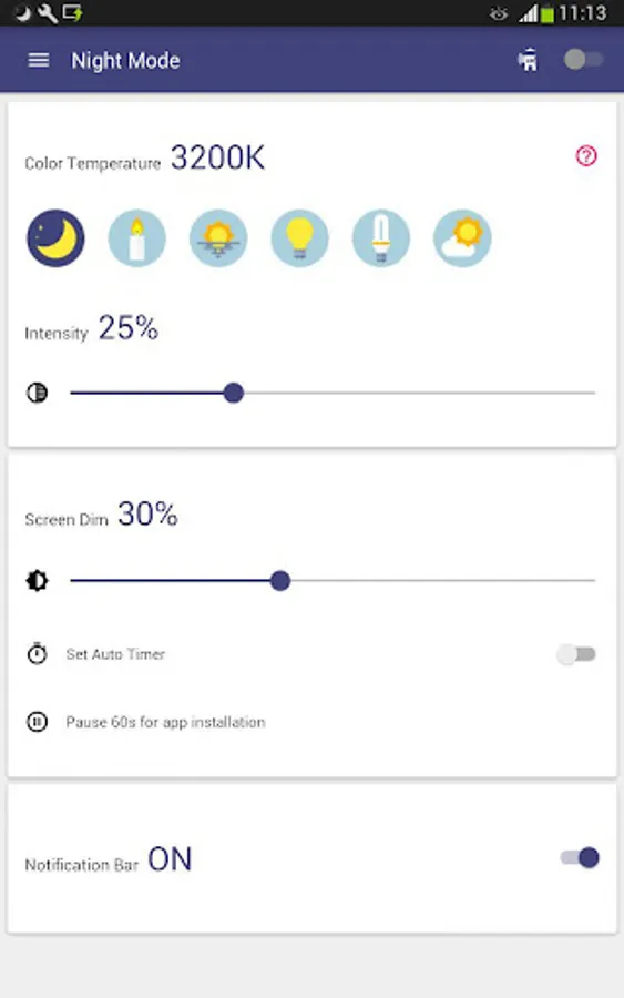 Handy buttons and auto timer will help you turn on and turn off the app in one second. Very useful app for eye care.