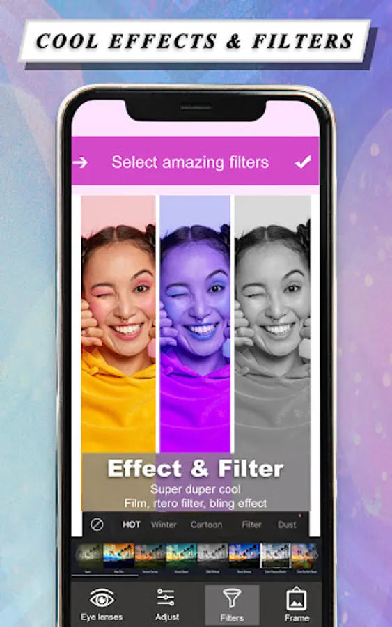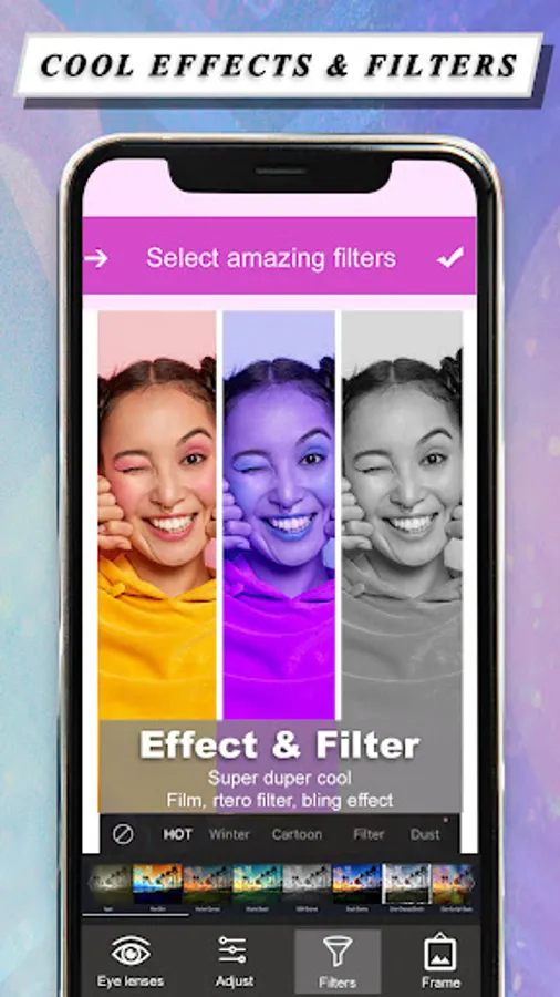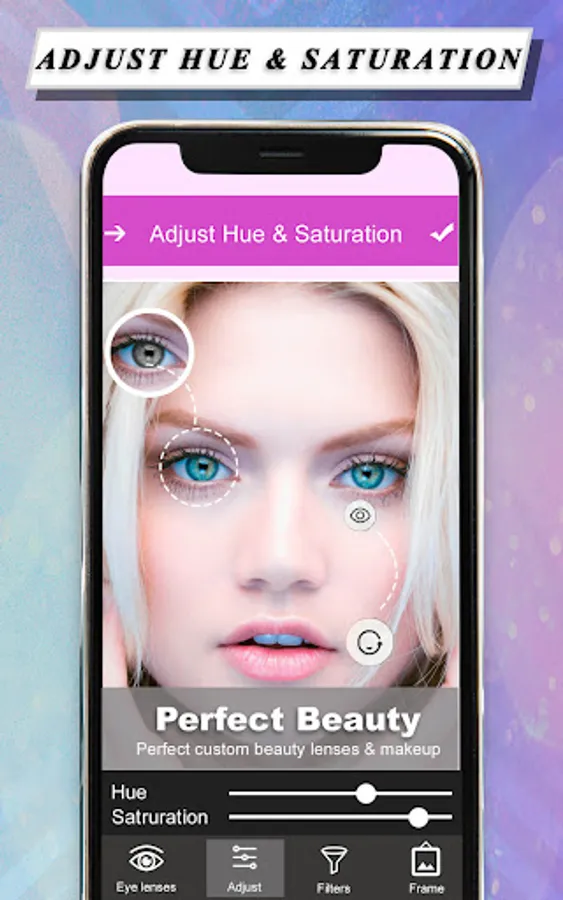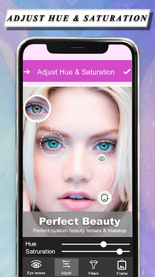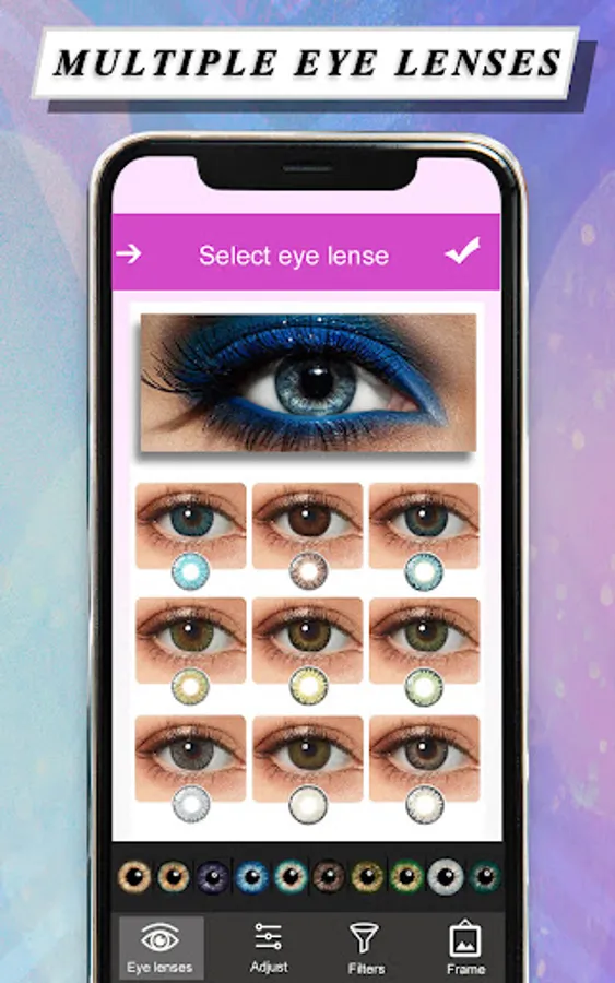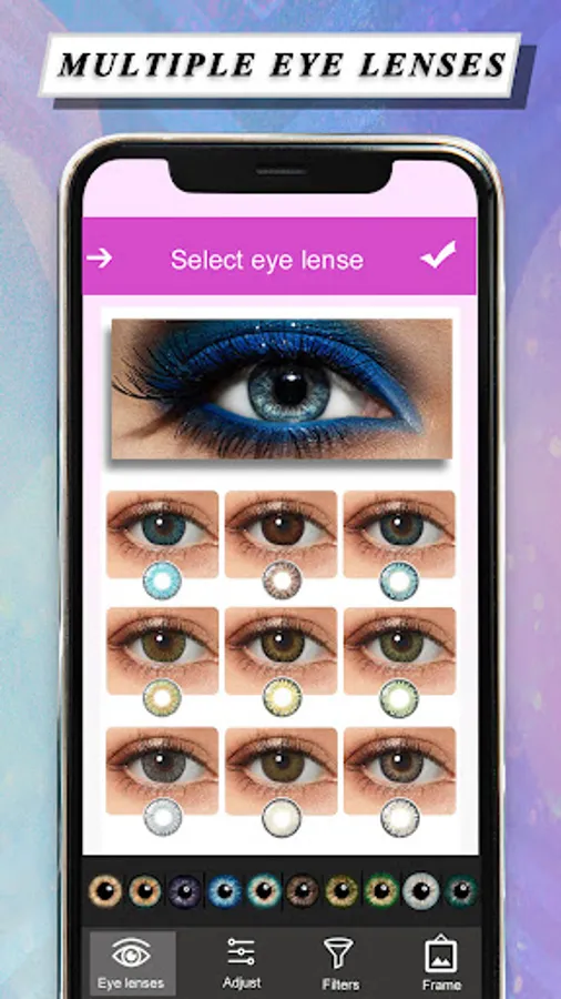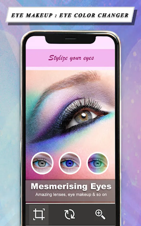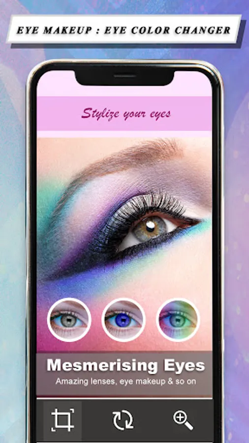 Change eye color in your photo instantly by this easy to use eye makeup tool. It changes eye color and adds cosmetic color eye lenses and accessories, create stunning visual effects in a photo without applying makeup. Eye Color Changer lets you change the color of your eyes lens! Eye makeup tool is a very simple simulation app for changing the eye color of your choice. you can pick amber, blue, brown, gray, green, hazel, red, and other your favorite colors or lens among a very big list of eye lenses.