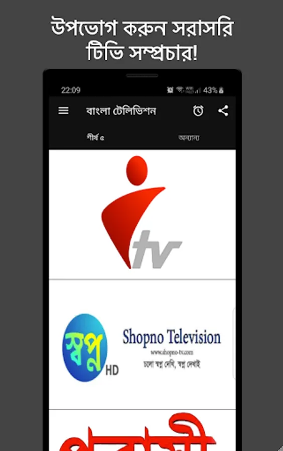 টিভি তালিকায় আছে এন টিভি, এটিএন নিউজ, আর টিভি, যমুনা টিভি, আই টিভি, প্রবাসী বাংলা টিভি এবং আরো অনেক চ্যানেল! এছাড়াও: