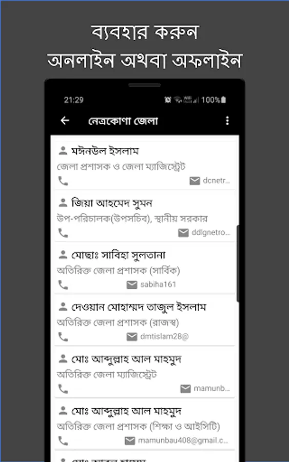 - Quickly search important phone numbers and email addresses of 64 districts of Bangladesh