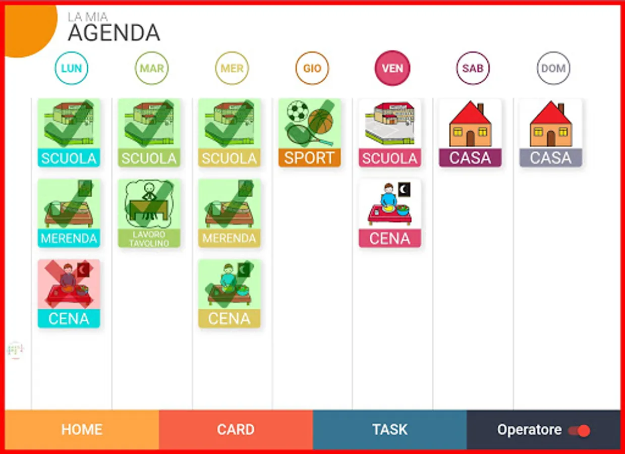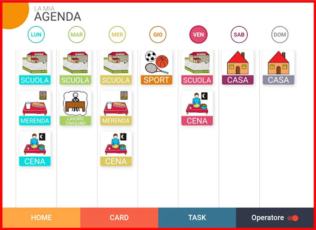 Visual agendas help people with DSA and DI to understand how a day is articulated and to know what is expected of them, thus reducing the worry that can generate the new and the unexpected. With visual agendas, predictability can be guaranteed, anticipating the various events that will occur (within a day or the whole week) and making the sequence of the various activities "visible".