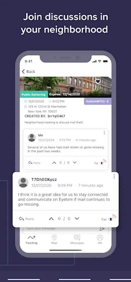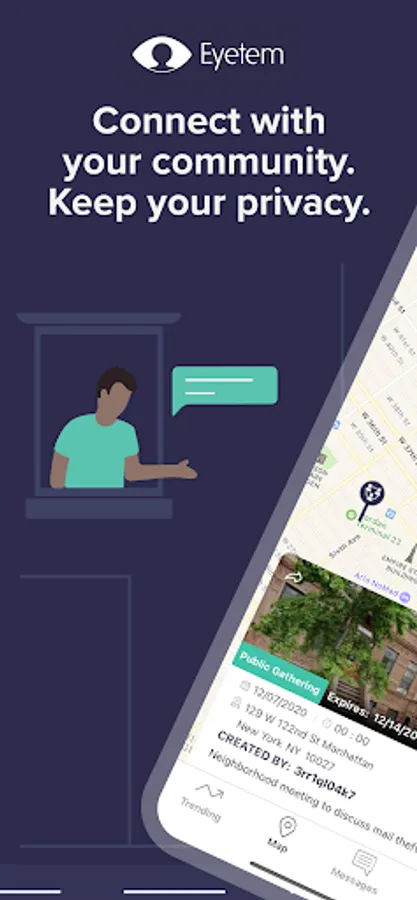 Connect with your community and stay safe with Eyetem. Eyetem is a secure and anonymous neighborhood app that keeps your information private. Why share your personal information when you don’t have to? While other apps require you to input your name, address, and more, Eyetem’s technology makes it easy to discuss and report crimes near your location without sharing your personal information.