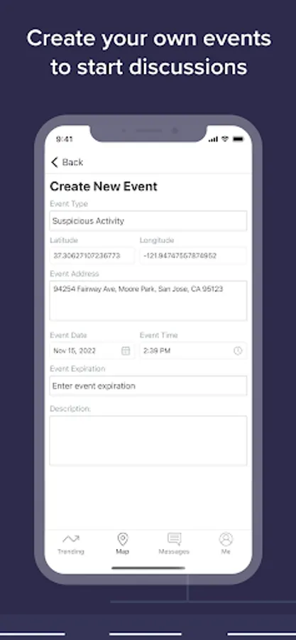 - Start a conversation or request information from others by creating an event in seconds