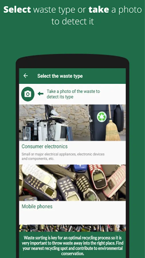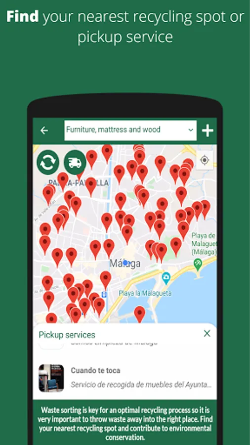 You have more than 65,000 geolocated spots throughout Spain territory (and growing) in your smartphone or tablet and now, with our waste detection system it is much easier. Just take a photo of the waste and the app will detect its type and locate the nearest recycling spot where you can drop it off!.