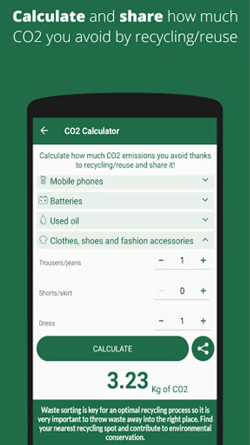 The app also includes a CO2 calculator for you to calculate and share how much CO2 emissions avoid when recycling your waste or donating/reusing what you no longer need, giving it a second life. You also have news related to the environment and recycling, and you can also mark municipalities/localities as favorites, so you can receive notifications with information and/or alerts for integrated services with your city council *!