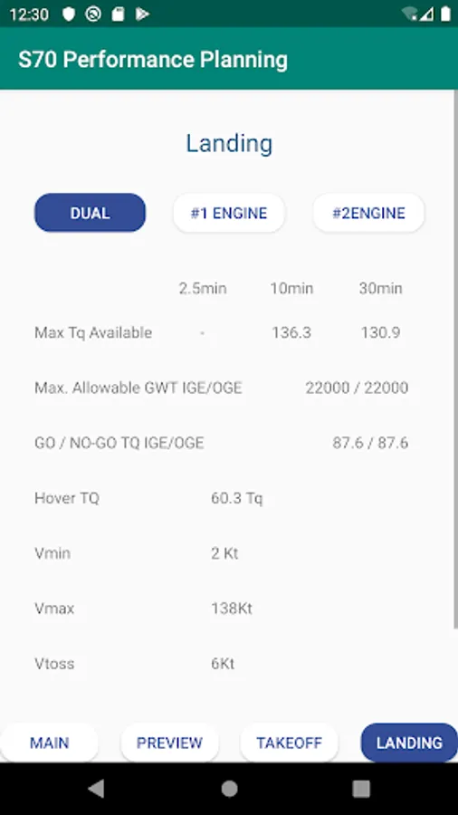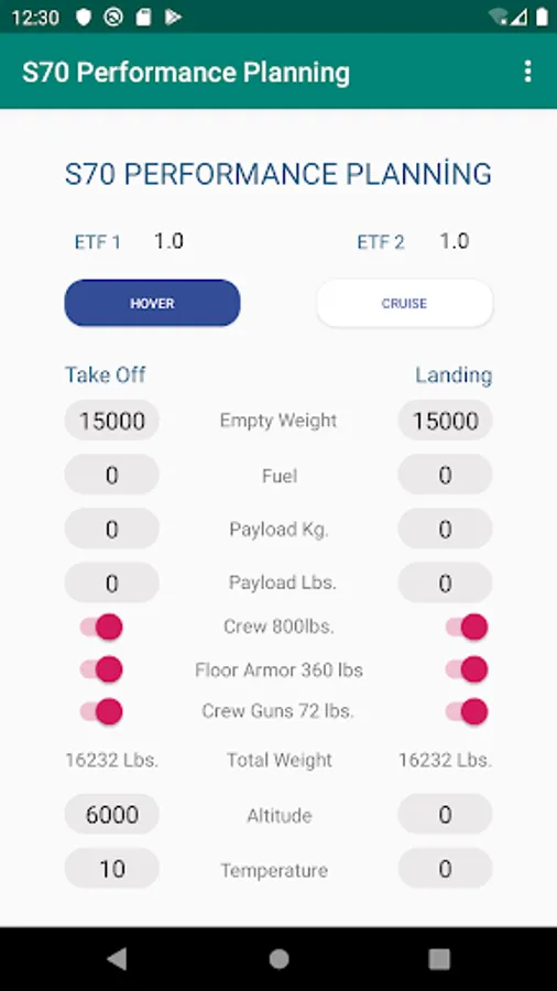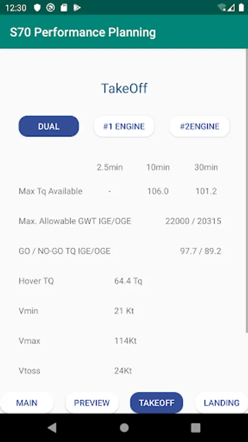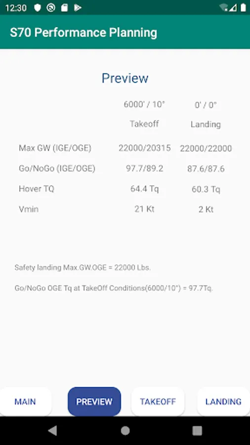 Application for full performance calculation for UH-60 Sikorsky-70A-28D helicopters T-700-GE-701C installed engines. Algorythms used in this app is generated with manual inputs. This is not an official application. The use of this app for flight preperation is under the sole responsibility of the user. User is advised that before flight use helicopters manuals for preperation.