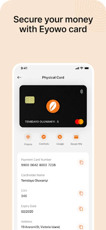 With Eyowo cards, we've removed all the information that fraudsters can use to steal your money. Your card information now lives in your app. This is the safest card in Nigeria.