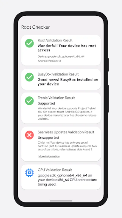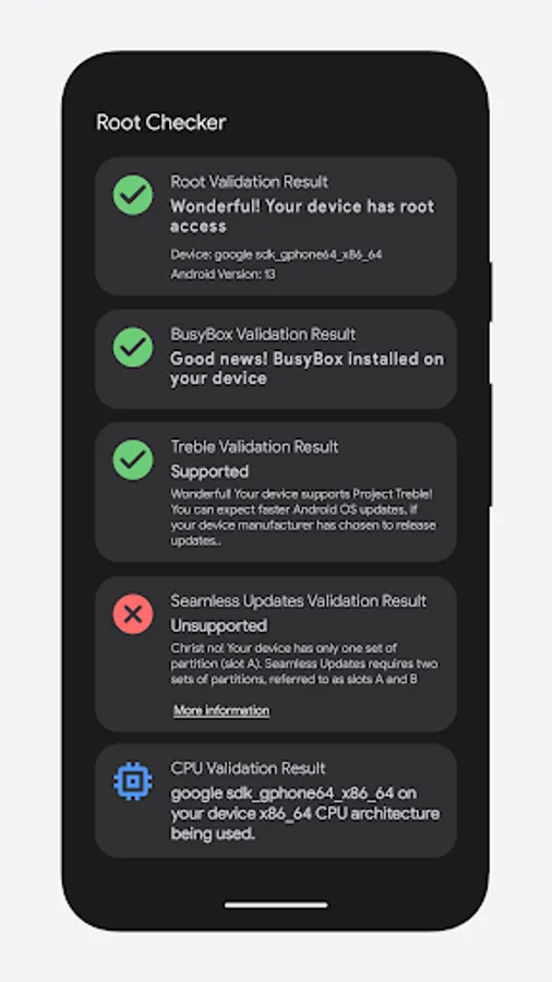 Got root or a custom ROM? Root Checker will let you know if your Android is rooted for root access and custom ROM installation. Made with 100% pure Android love for root users!