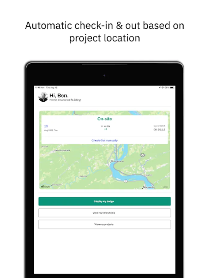 Projects can be joined easily by scanning a QR code. Then complete the necessary registration information, review and sign documents, and submit for review. Once registration is approved head to the jobsite to automatically track work hours. The app handles check-in and check-out automatically based on project location.