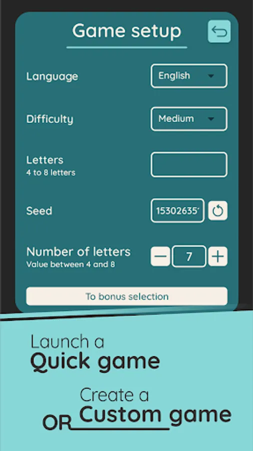 Launch a game in one click with pre-set options or custom your own game by choosing the language, the difficulty, the number of letters, the letters themselves, the seed and also the bonuses to which you will have access!