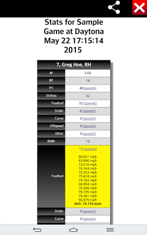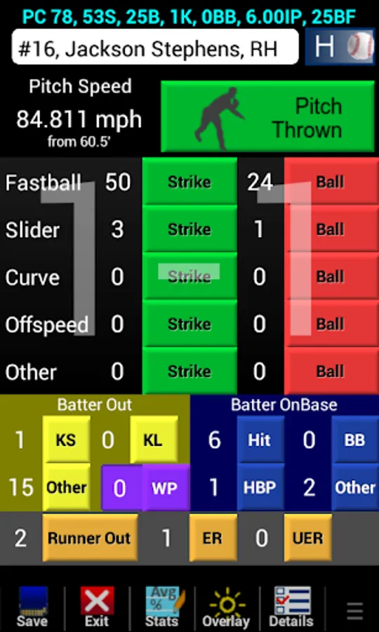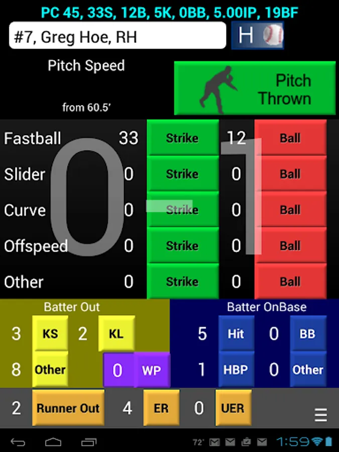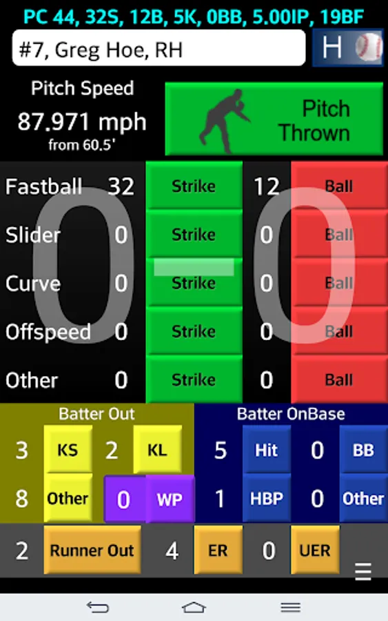 Pitch Counter Pro lets you track your pitcher's performance with detailed stats, built-in speed estimator, and customizable rest warning alerts. Get real-time stats on your pitchers including Pitch Count, Strikes, Balls, Batters Faced, Strikeouts Swinging, Strikeouts Looking, Base on Balls, Hit By Pitch, First Pitch Strike, Innings Pitched, Earned Run Average, and more! Optionally estimate the speed of every pitch thrown and decide when your pitcher is losing his stuff. Includes built-in rest warnings that let you know when your pitcher has reached pitch count rest limits for your pitcher's age group. Easily provide pitch count information to umpires and team managers during the game.