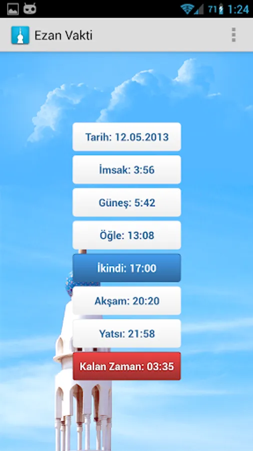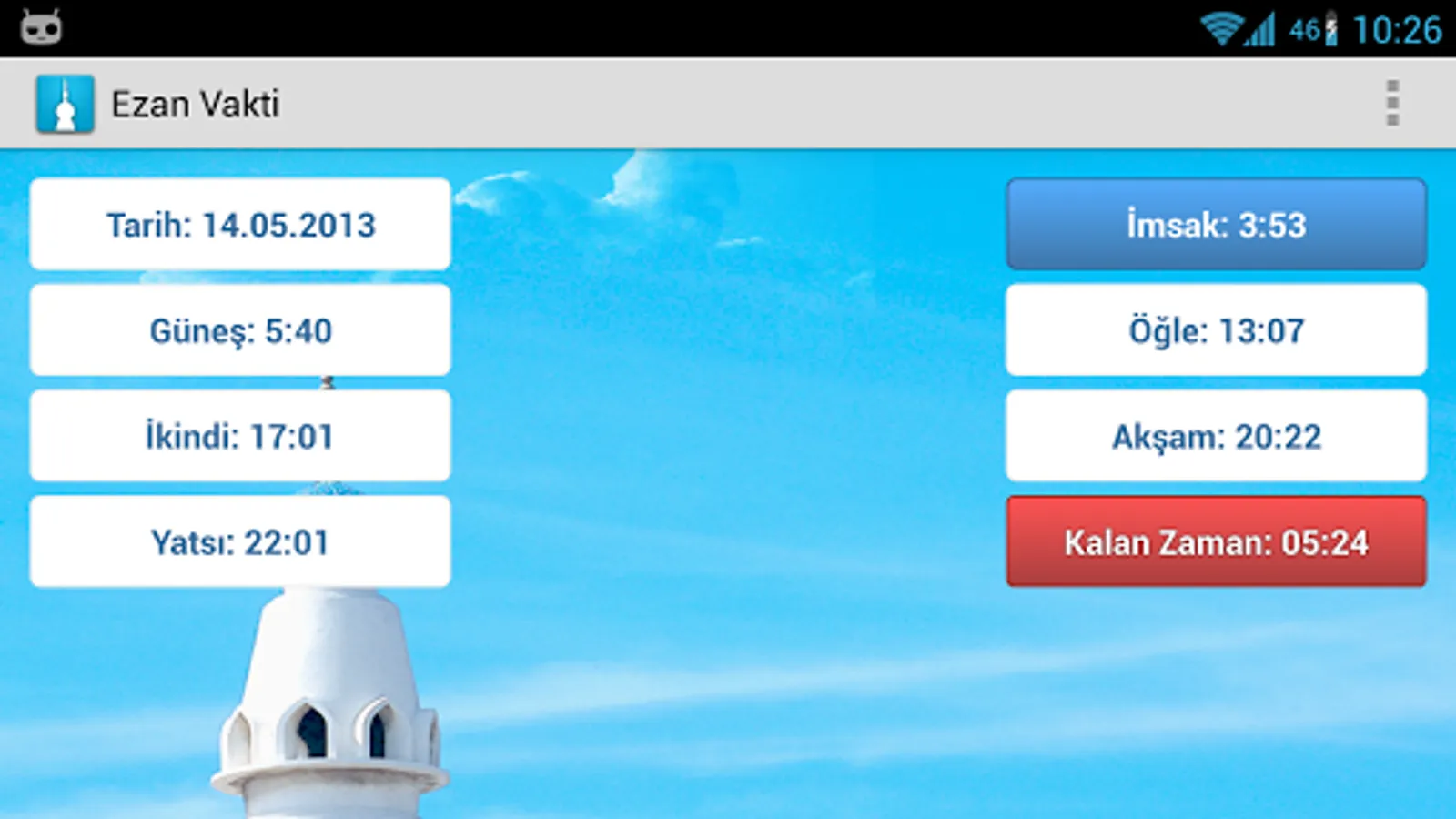 Ezan Vakti programı ile Türkiye'nin tüm illeri için, resmi ezan saatleri telefonunuzda. Ezan Vakti programının widget'ı sayesinde sıradaki namaz saatini telefonunuzun ana ekranında görebilirsiniz. Uygulama ekranından günün ezan saatleri ve sıradaki ezana kalan zamanı öğrenebilirsiniz.