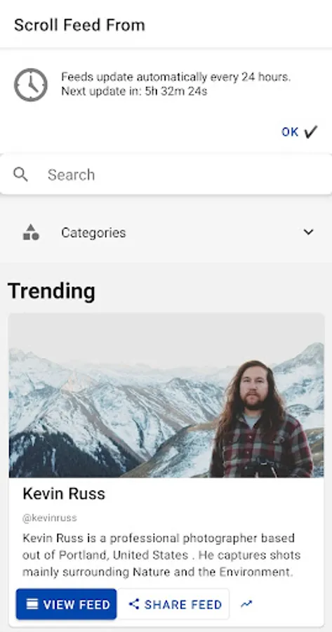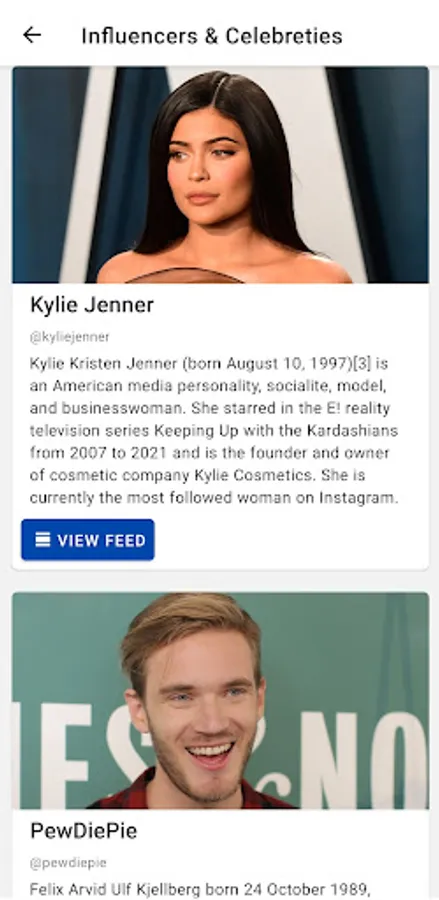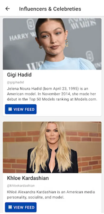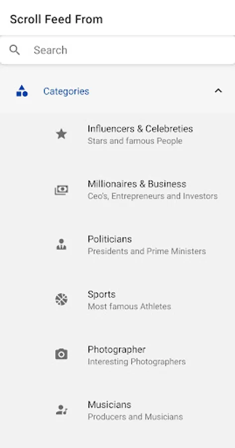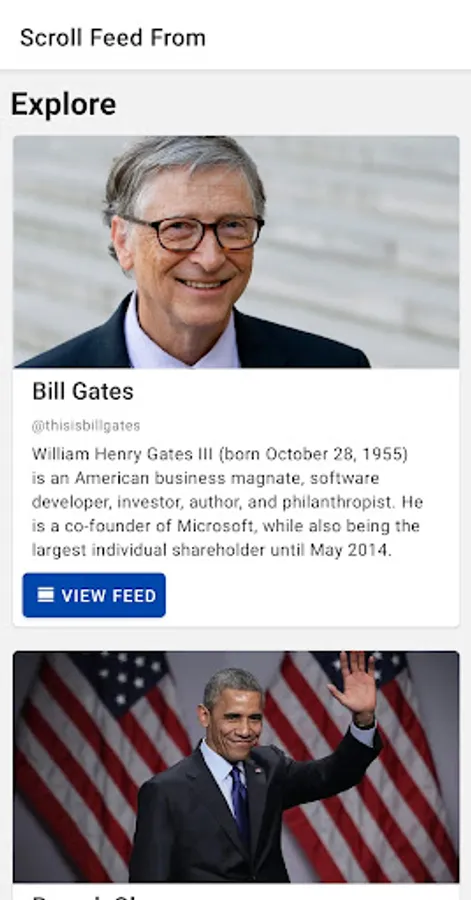 "Scroll Feed From" shows you what your favourite Celebrities, Ceo's, Photographers and Scientists Instagram Feed looks like.