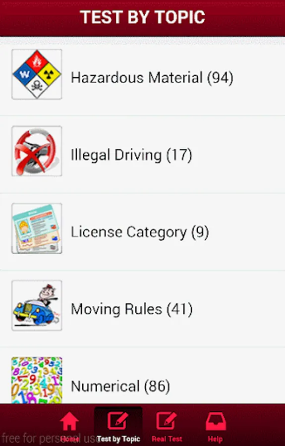 Alabama Commercial Driving test has 500+ Questions.There are 25 different Categories from which you can select a Category and practice the test There are 10 DMV test each having 50 Questions, which is same as the real test. By practicing this test you can PASS the WRITTEN TEST in FIRST ATTEMPT.