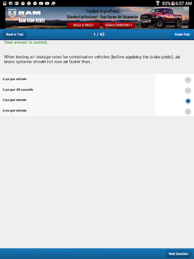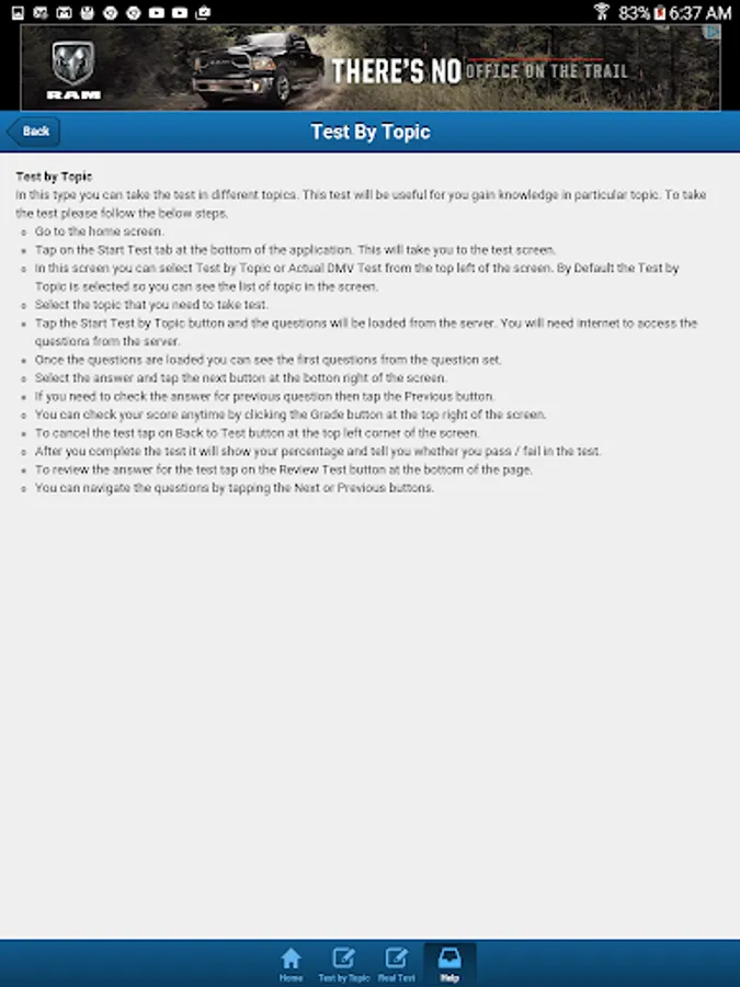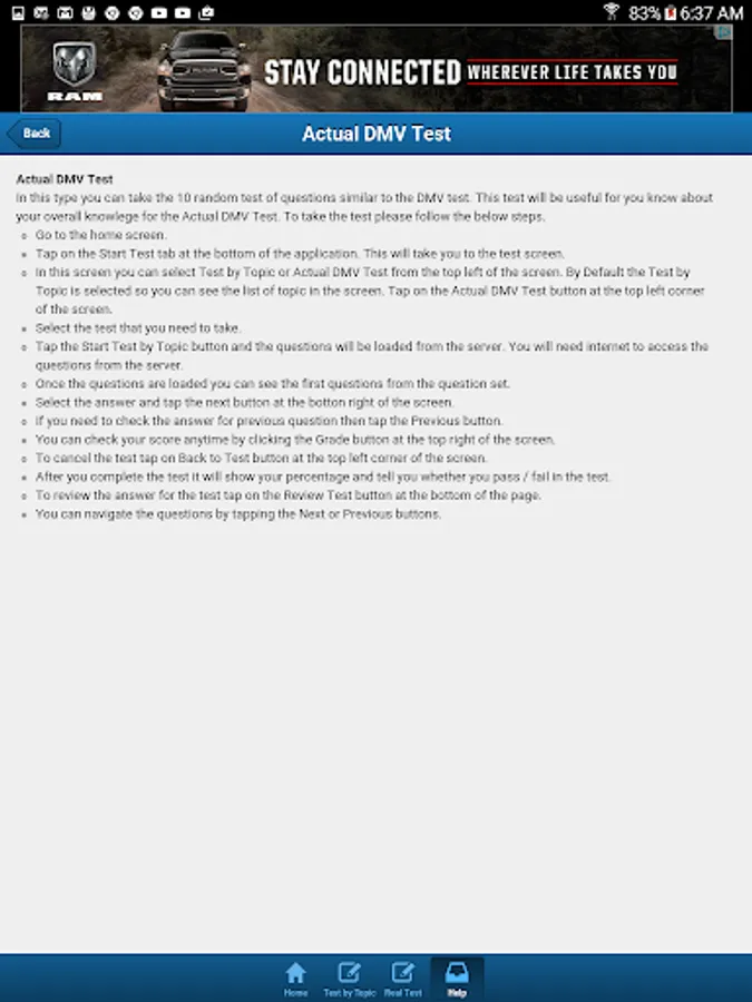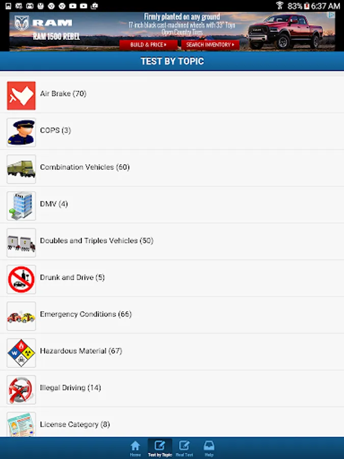Montana Commercial Driving test has 500+ Questions.There are 25 different Categories from which you can select a Category and practice the test There are 10 DMV test each having 50 Questions, which is same as the real test. By practicing this test you can PASS the WRITTEN TEST in FIRST ATTEMPT.