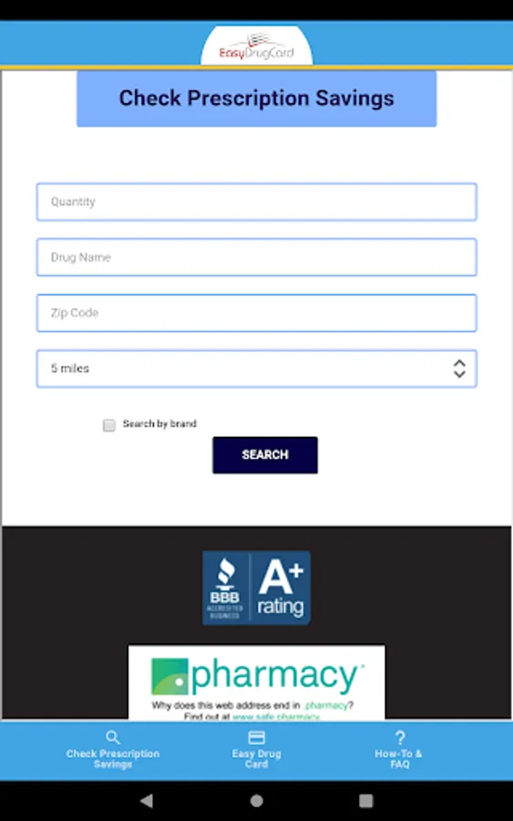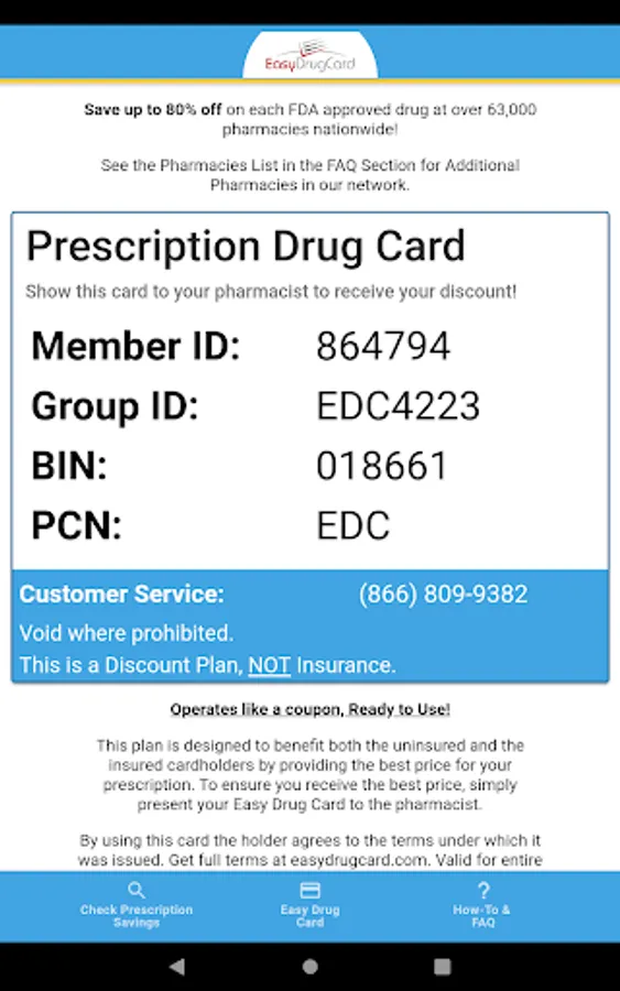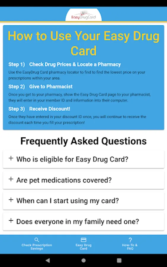 • Our app opens with a discount card you can take to your pharmacy for immediate savings on your prescriptions.