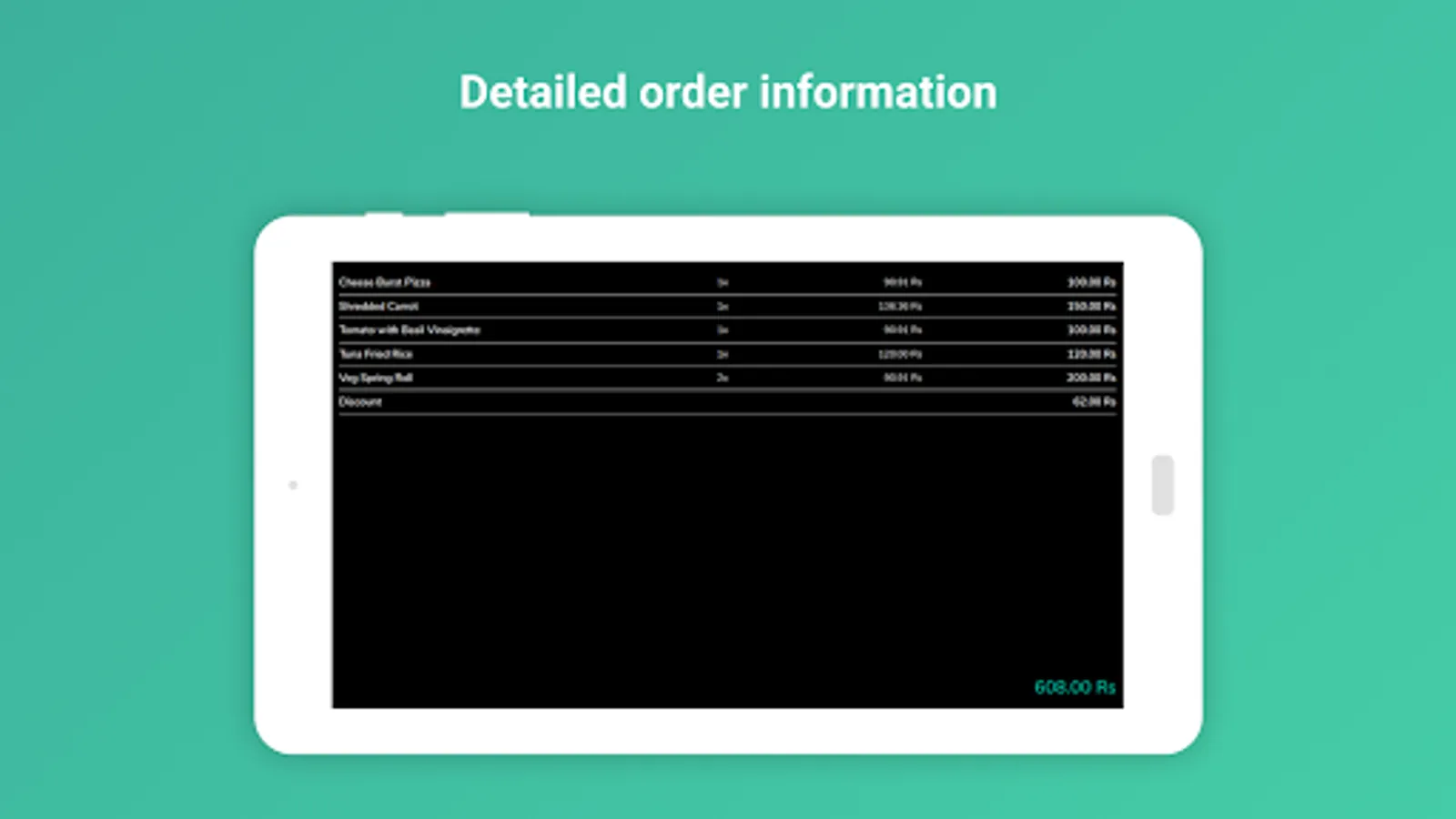 - Displays order information namely items, modifiers, discounts, total amount, payment done and change due.
