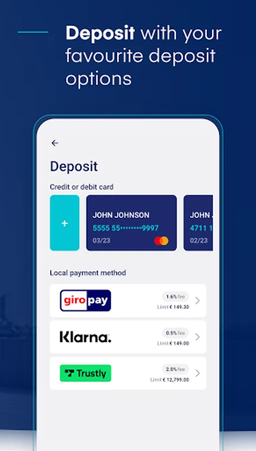 • Wide range of deposit options, including credit cards and 50+ local payment methods