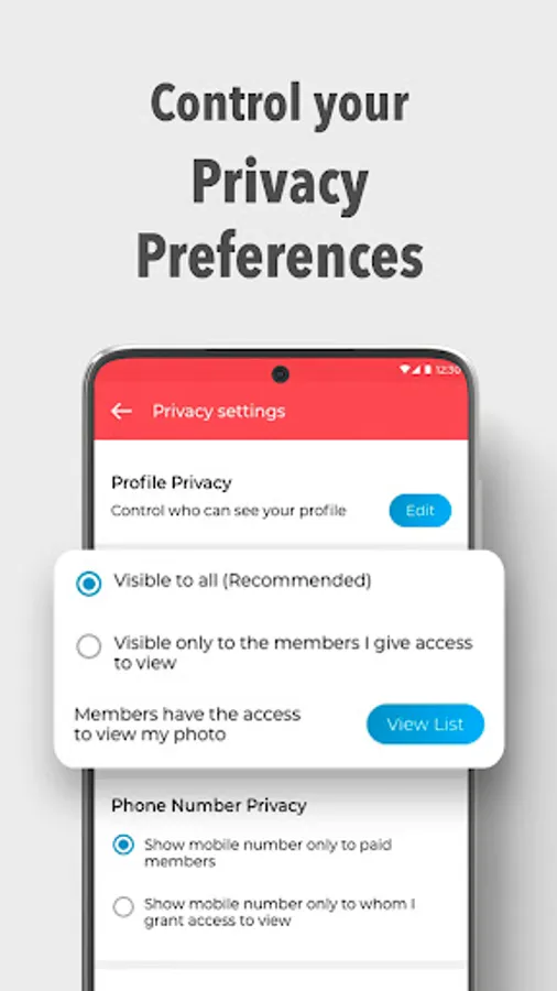 Our “Who Can See Me™” feature allows you complete control of who can see your profile and contact you. You can decide to set various criteria such as age, income, education, community etc., and allow only matches who meet these criteria to view and contact you.