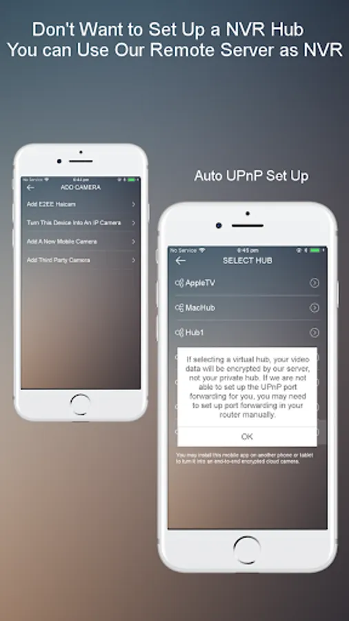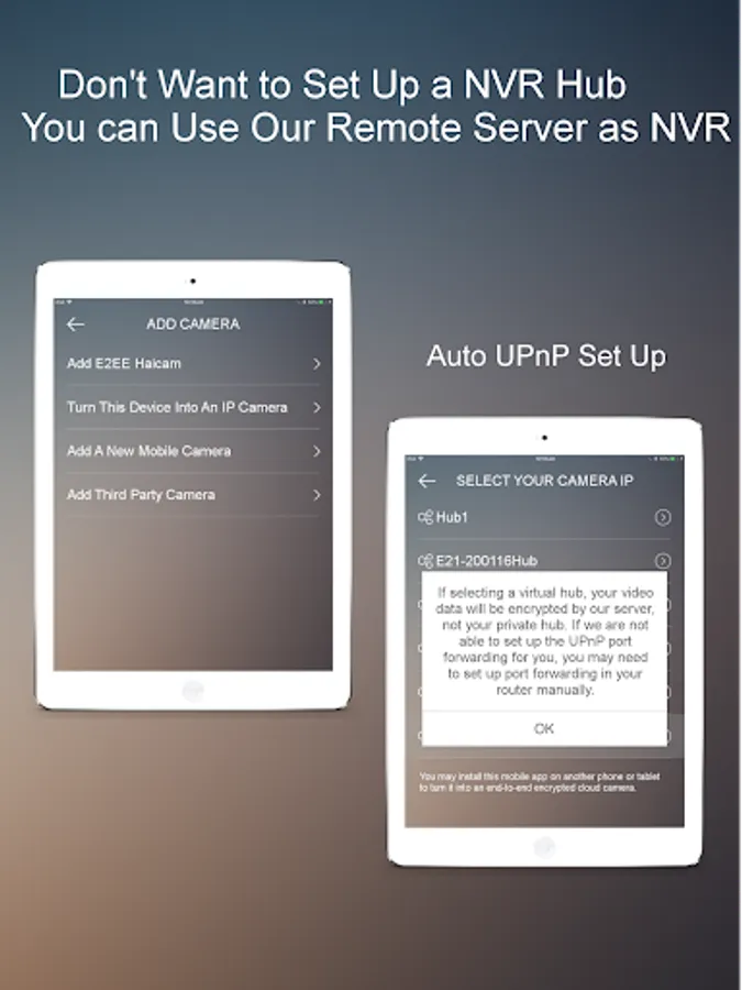 Don't want to setup an E2EE camera hub now? No problem! You can connect your camera to our server directly by our virtual hub, we will setup UPnP port forwarding for your camera automatically if possible. Our server will take care the encryption for you in this case.