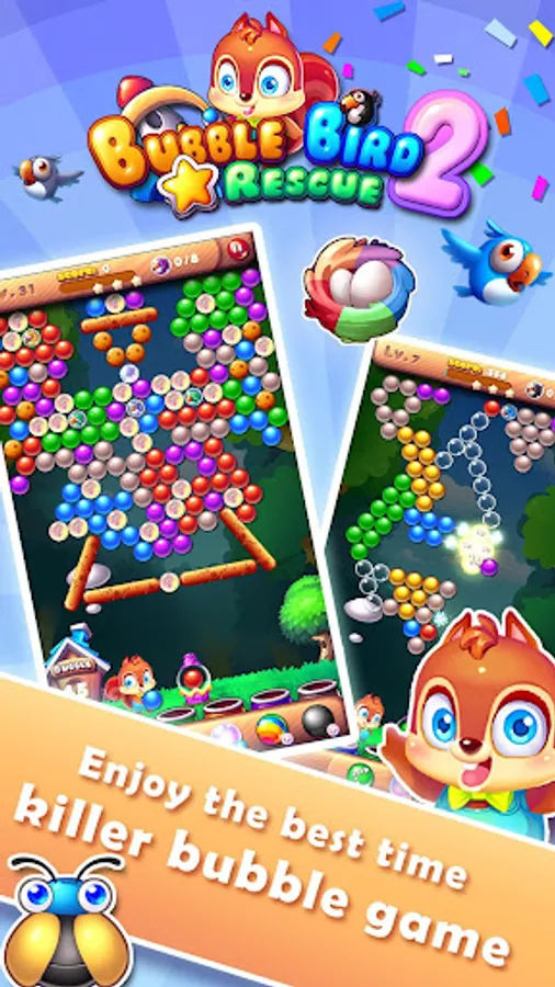 Shoot bubbles and match colors to pop and drop your way to rescue the trapped baby birds! You’ll be addicted to "Bubble Bird Rescue 2" from the first hit!