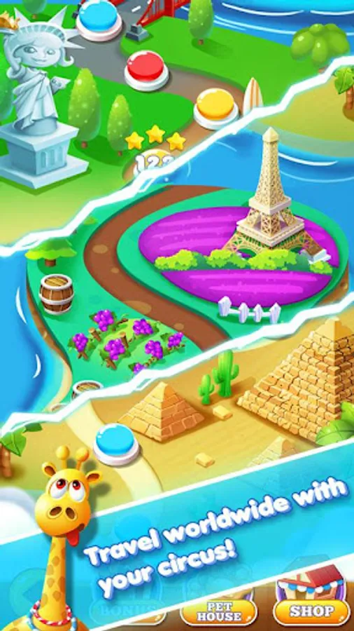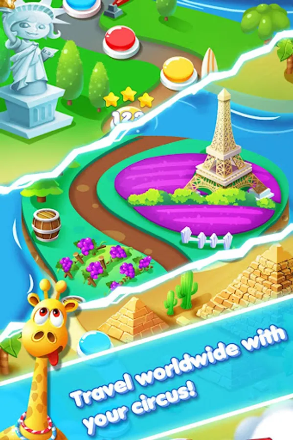 ★ Eye-catching graphics and maps, travel around the world with your circus!