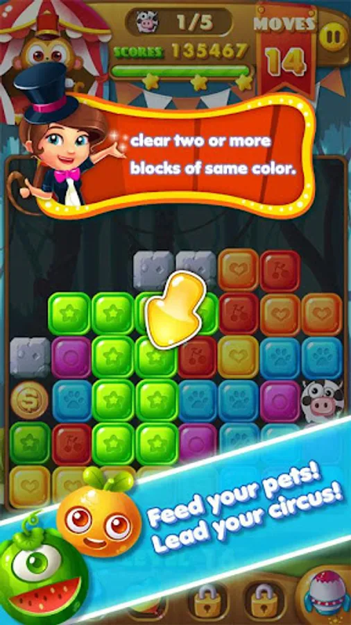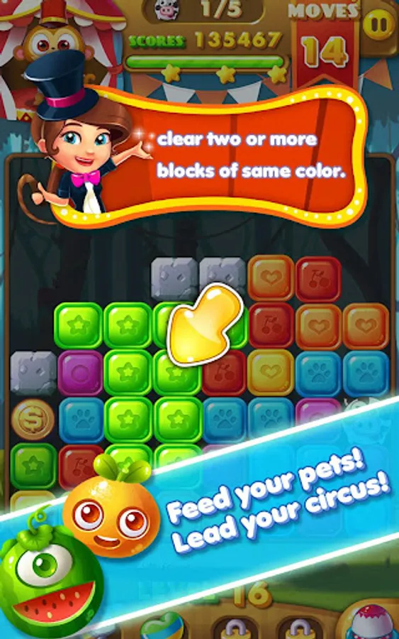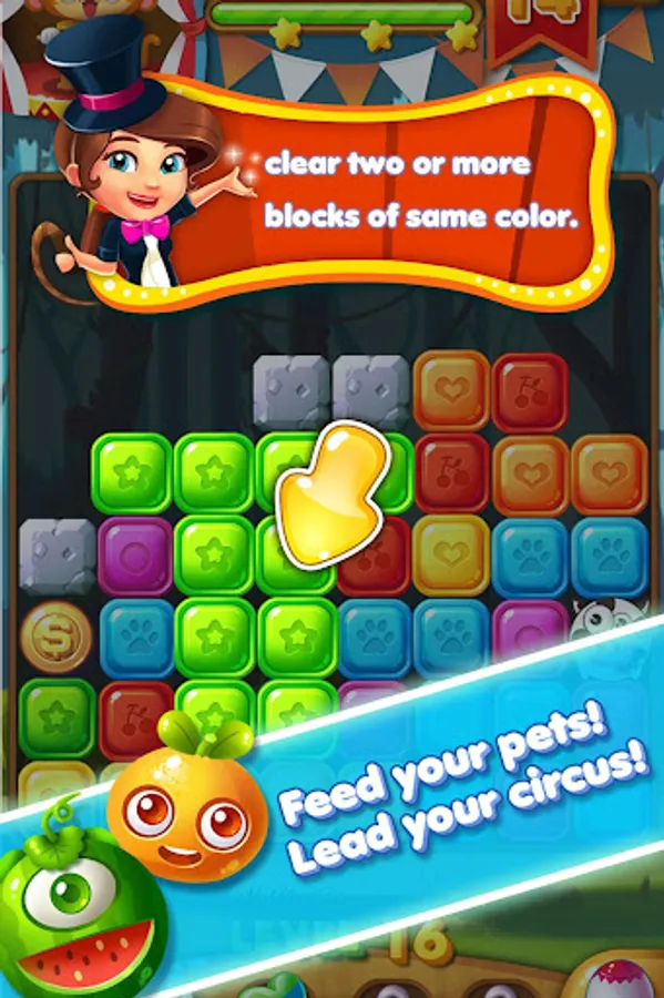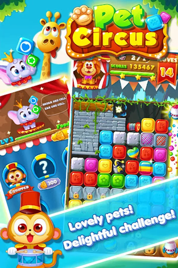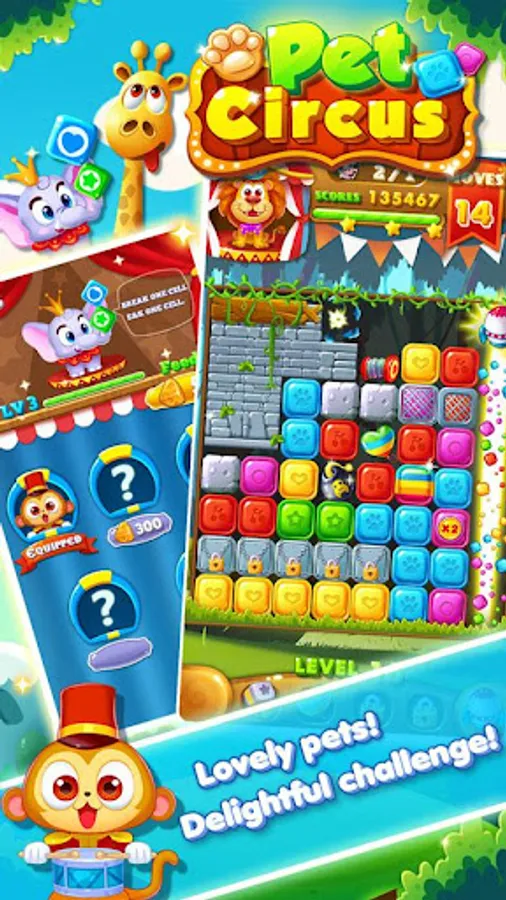 Pet Circus,a brand new puzzle game from Ezjoy will surely bring you a delightful journey unlike anything you have played before!5 more pets, worldwide maps and hero challenge brings you a fresh new experience.Tap on two or more same color blocks, collect food to feed pets and lead your circus!You're the leader of the circus, come and take on your friends in this joyful free phone game!