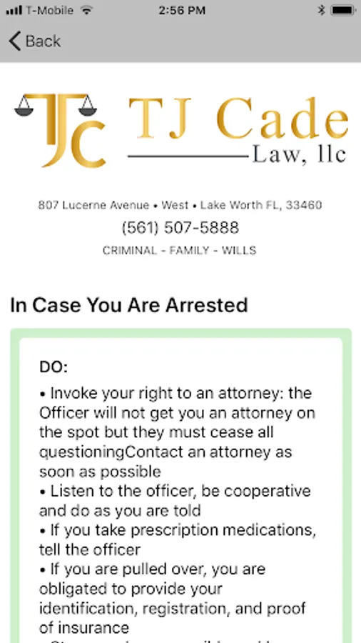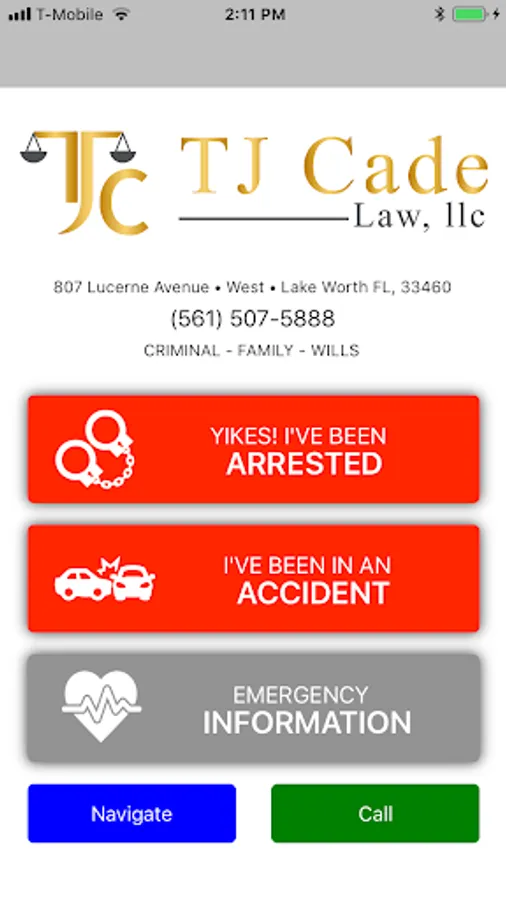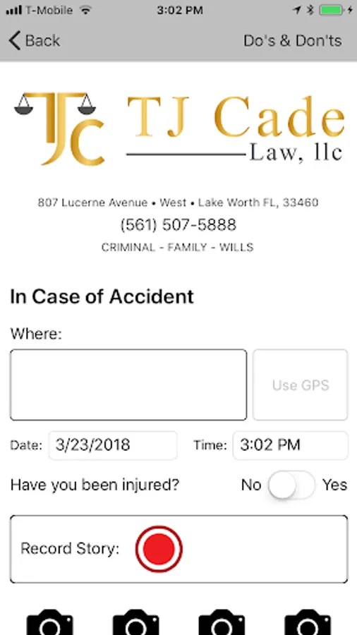 This application provides a direct link to the law firm of TJ Cade. It allows you to save In Case of Emergency information, and has hot buttons for Accidents and Arrests, in which you can record your story using voice, pictures, and video, and send it directly to TJ Cade from your phone.
