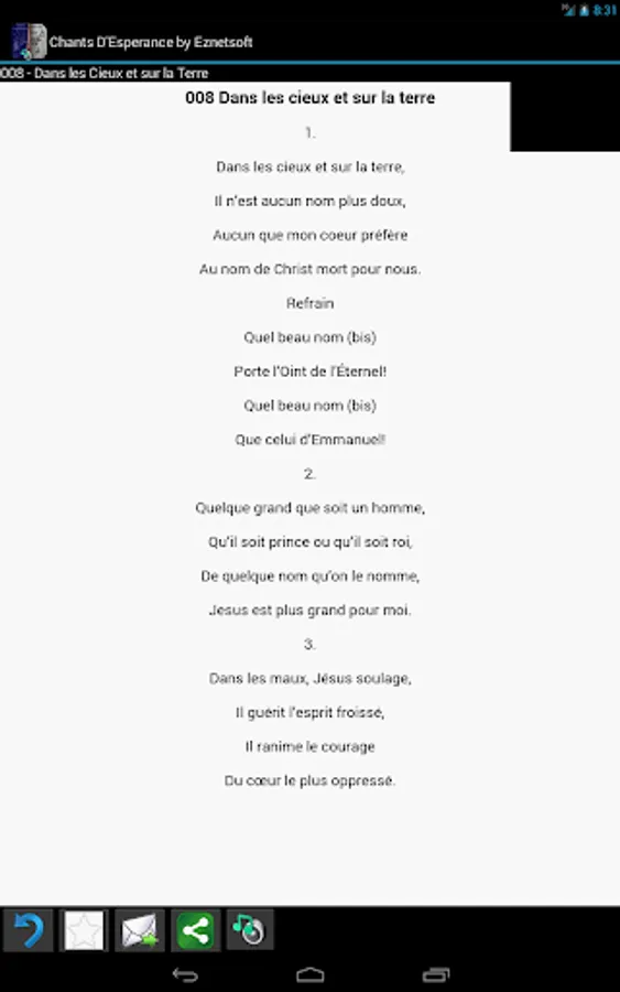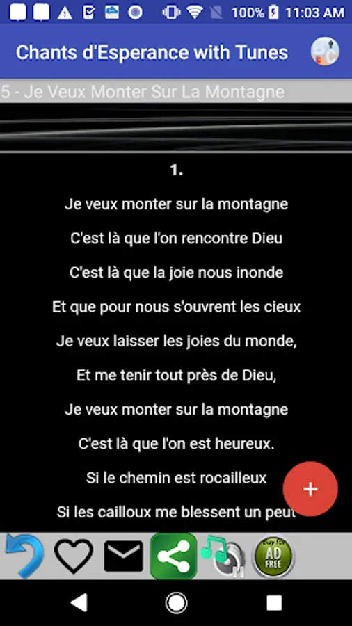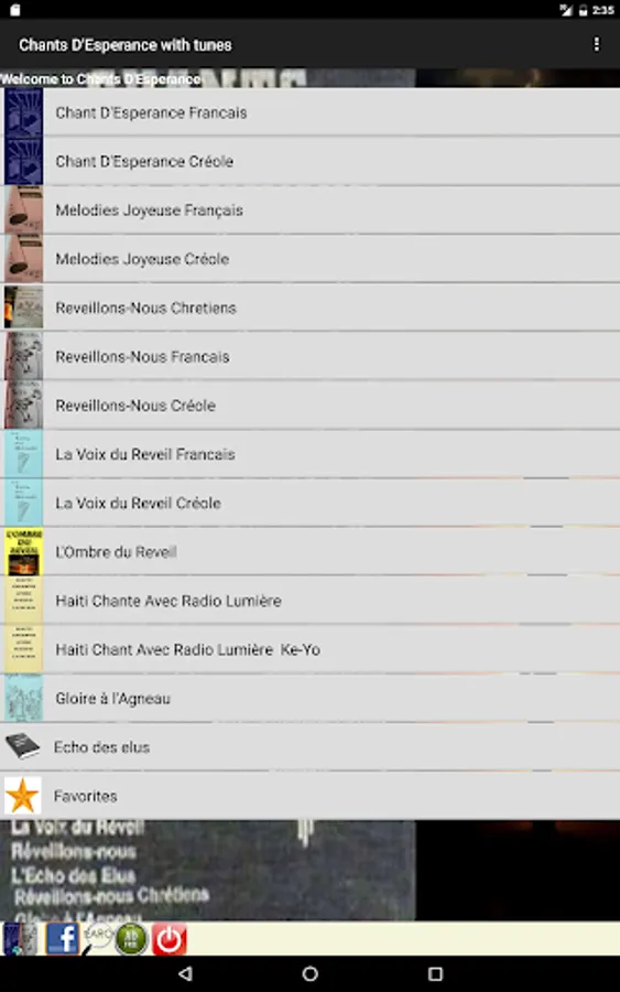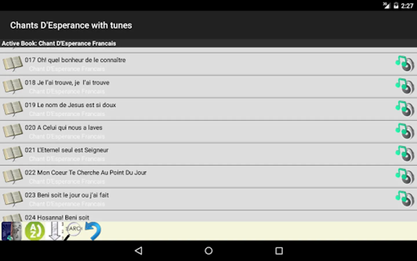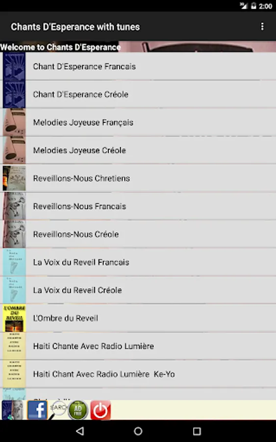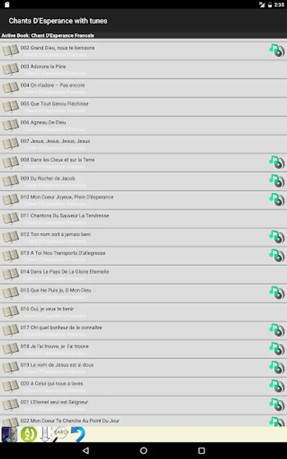 Chants D'Esperance with Tunes provides you access to all the lyrics of the songbook Chants D'Esperance. In addition to one bonus traditional hymn book in English, the App showcases all 9 hymn books in French and Creole: Chants D'Esperance, Melodies Joyeuse, Reveillons-Nous, La Voix du Reveil, Haiti Chante Avec Radio Lumiere, Echo Des Elus, Gloire a l'Agneau, Reveillons-nous chretiens, L'Ombre du Reveil, and Popular English Christian Hymns.