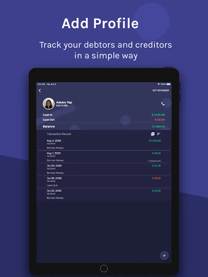 🧑 Profile – Add debtor or loaner from your contact list or fill a designed form.