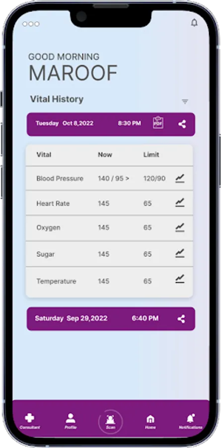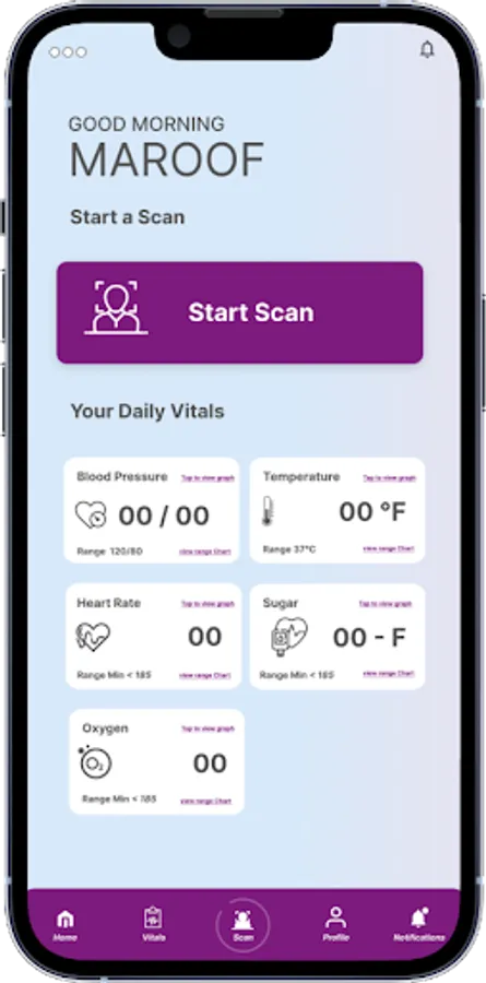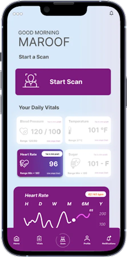 Measure: Make a short face video by a simple tap. Don't move while making the video. Keep the face in the video box. Video is sent to the AI modules. AI modules used rPPG technology to calculate vitals.