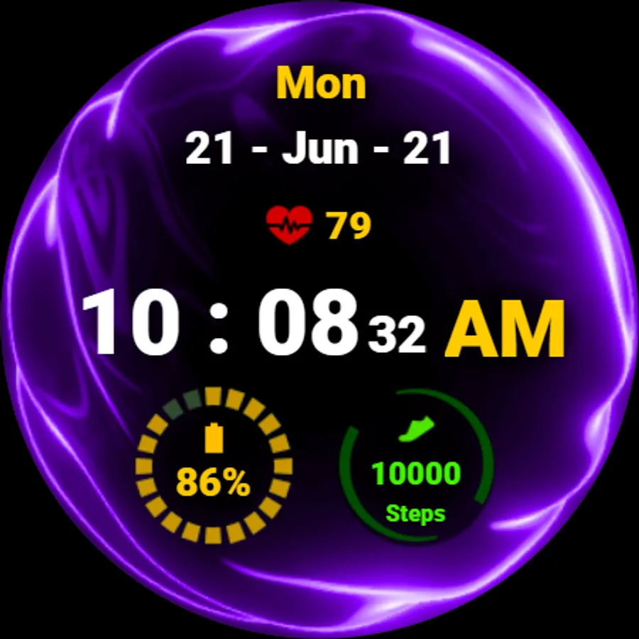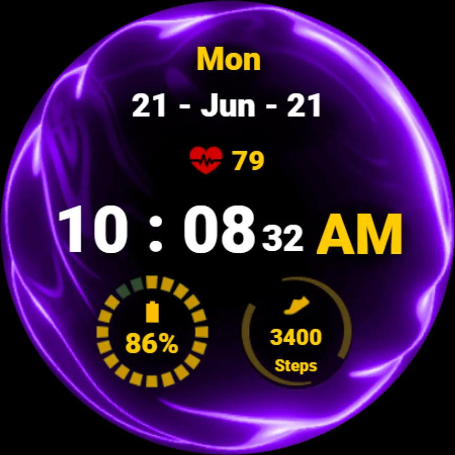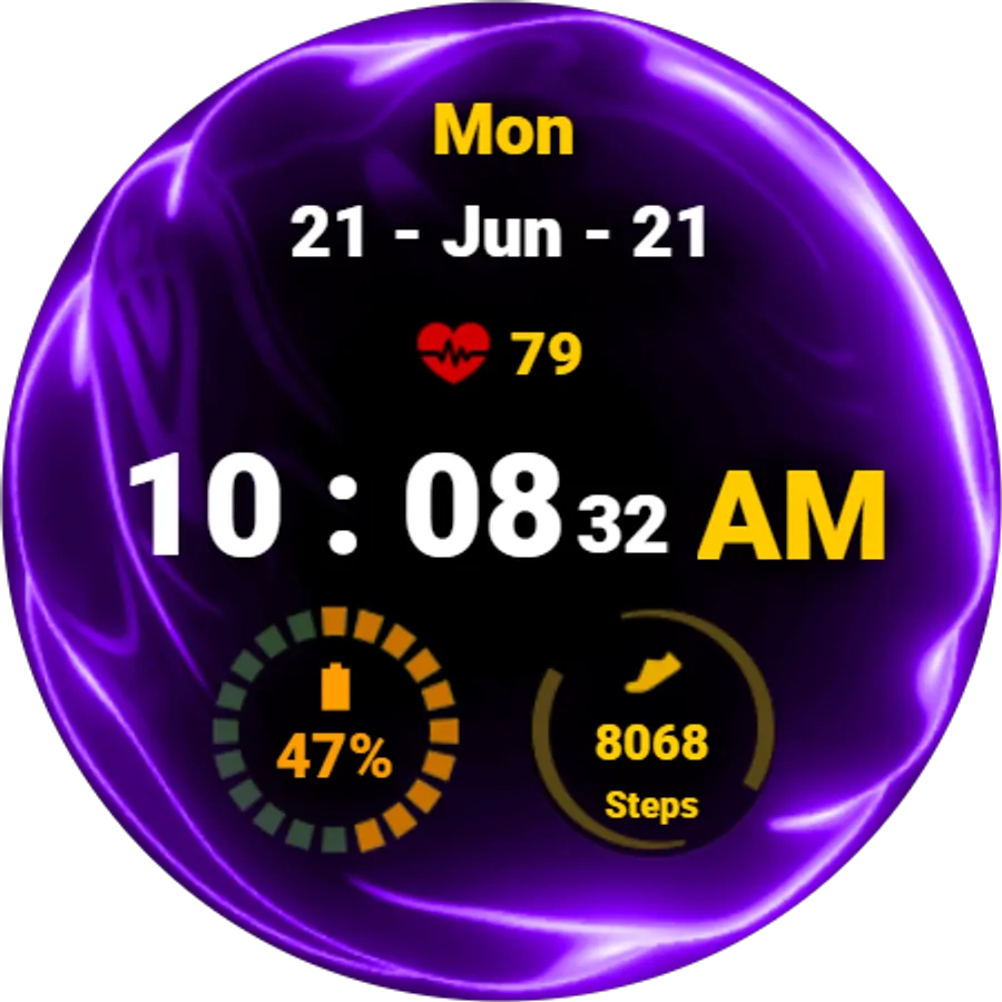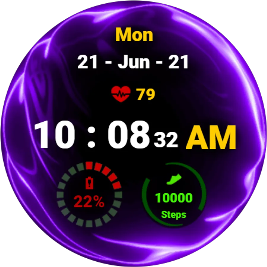 Simple digital watch face for Wear OS with animated fluid theme. With a glance at the watch face, you will be able to see the important information (The date, time, heart beat rate, number of steps, and battery percentage). The animated background creates a cool effect that will make you stand out from the others. Furthermore, the color of the battery indicator changes according to the battery percentage allowing you to immediately know where your battery level at without focusing on the details. Similarly, the number of steps will glow green when you reach your daily target. It is amazing yet not battery friendly. It supports always on display mode with 12- and 24-hour formats.