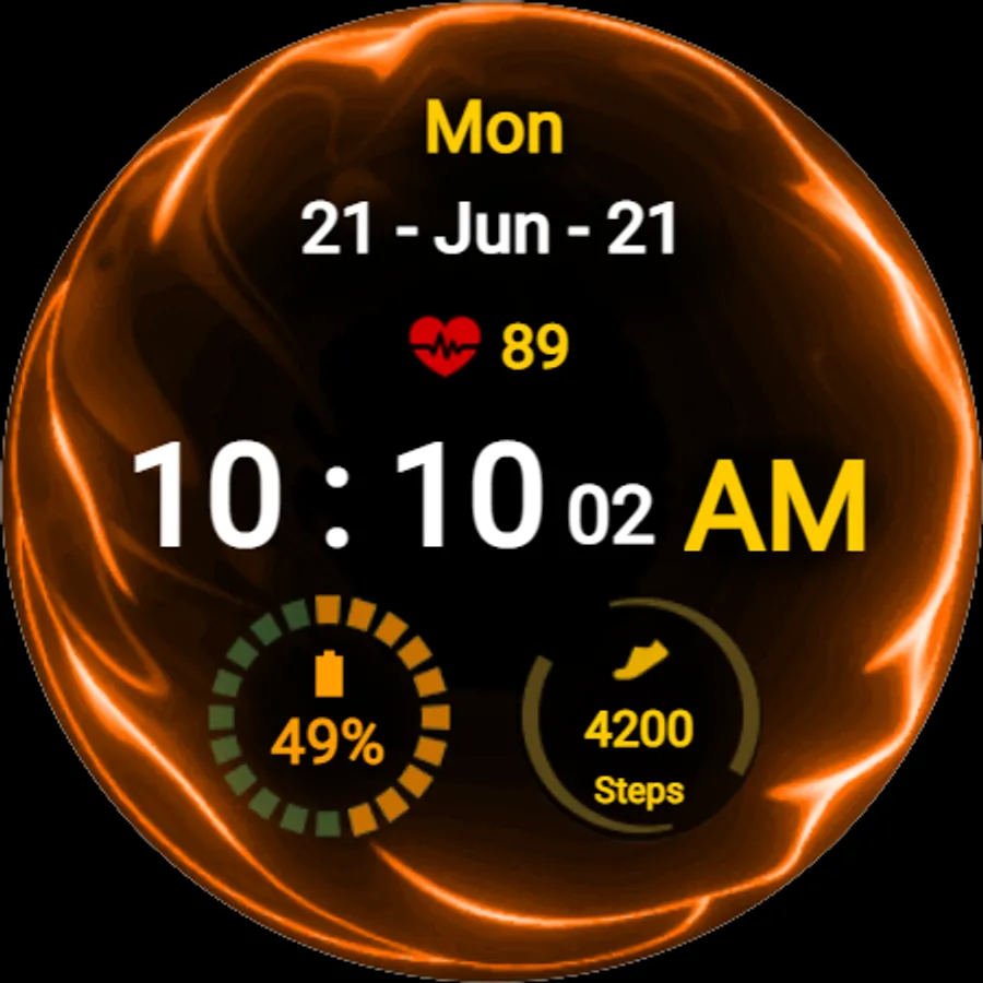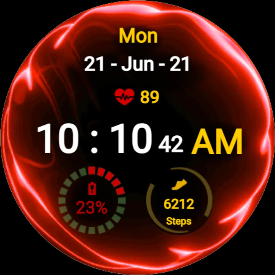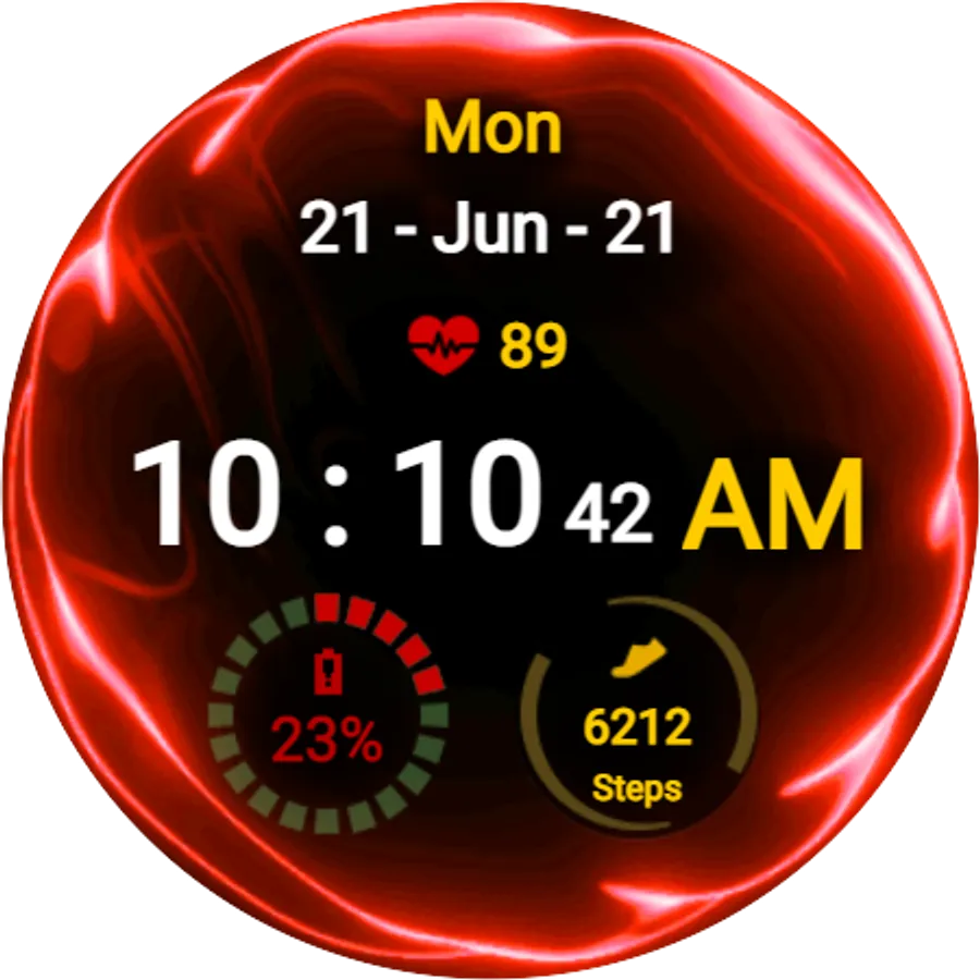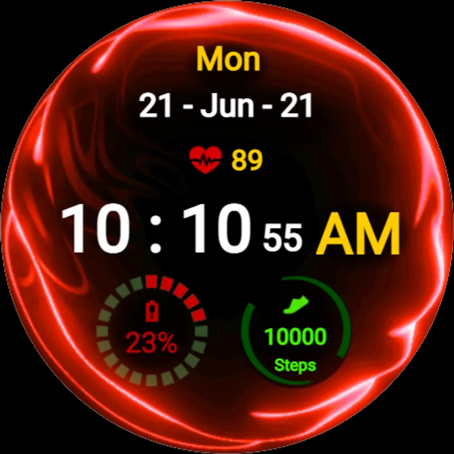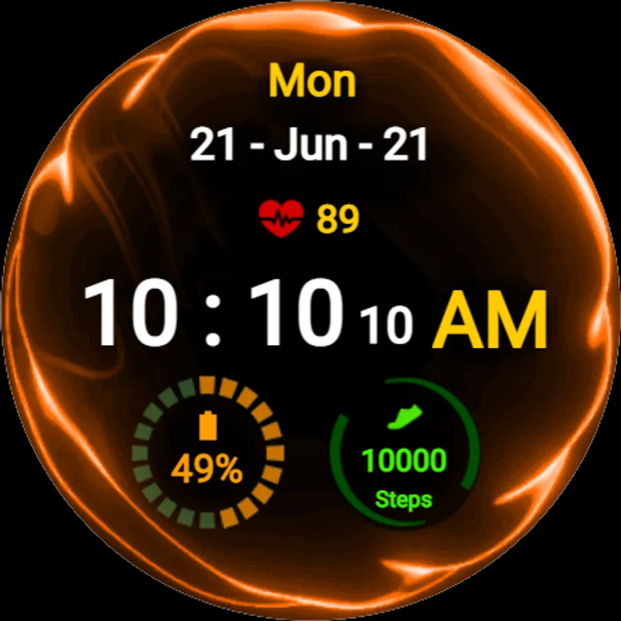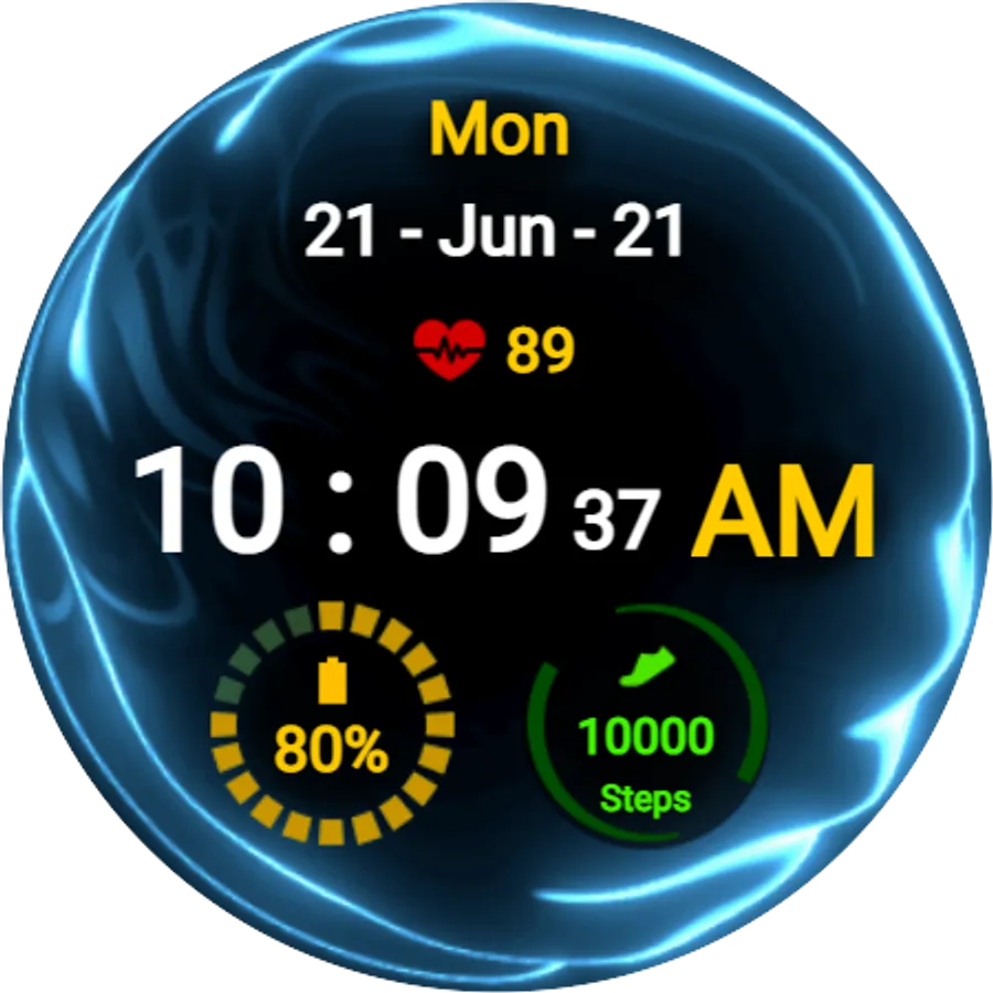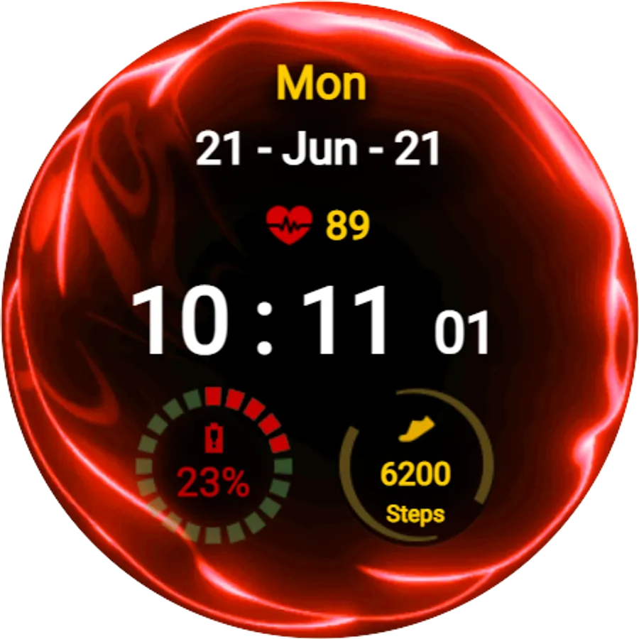 Simple digital watch face for Wear OS with animated fluid theme. With a glance at the watch face, you will be able to see the important information (The date, time, heart beat rate, number of steps, and battery percentage). The animated background creates a cool effect that will make you stand out from the others. Furthermore, the animated background color and the color of the battery indicator changes according to the battery percentage allowing you to immediately know where your battery level at without focusing on the details. Similarly, the number of steps will glow green when you reach your daily target. It supports always on display mode with 12- and 24-hour formats designed for Wear OS and designed for you.