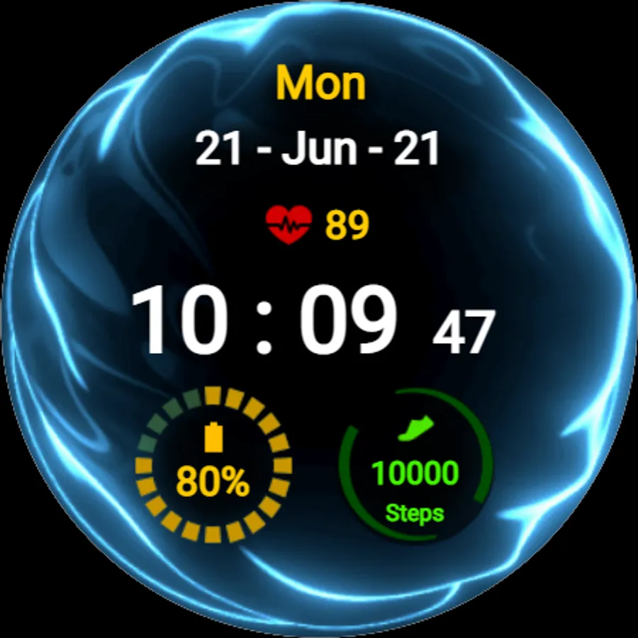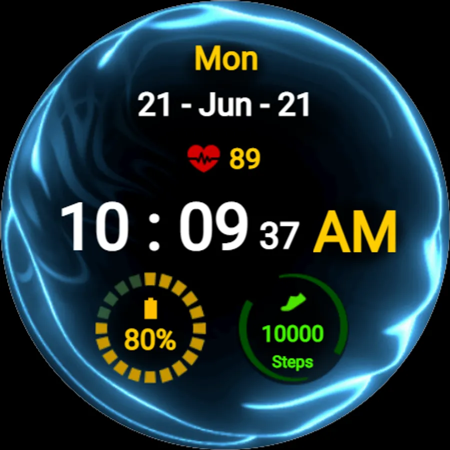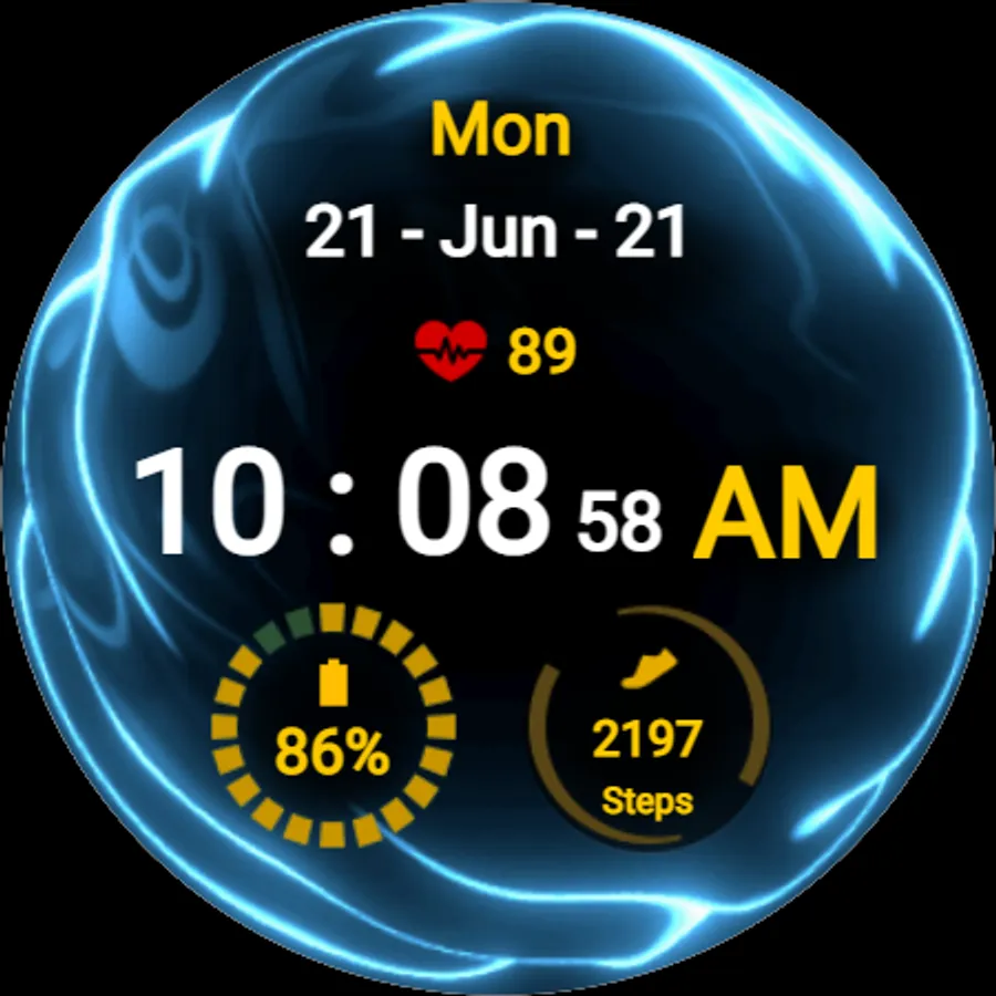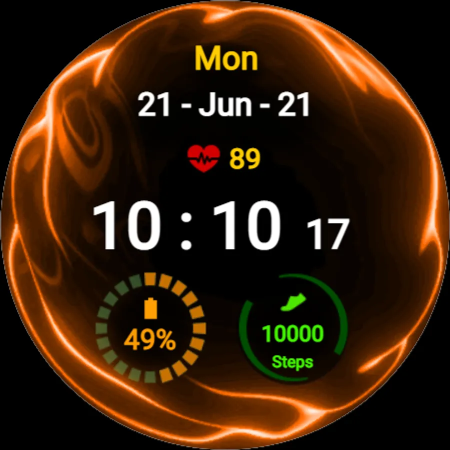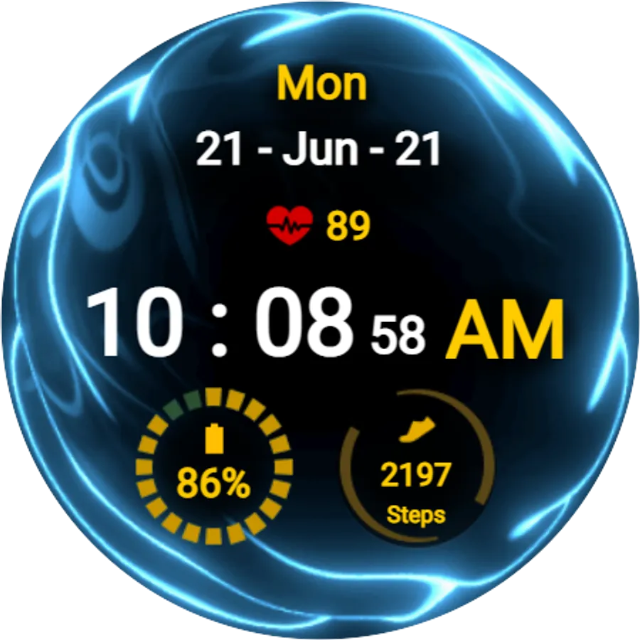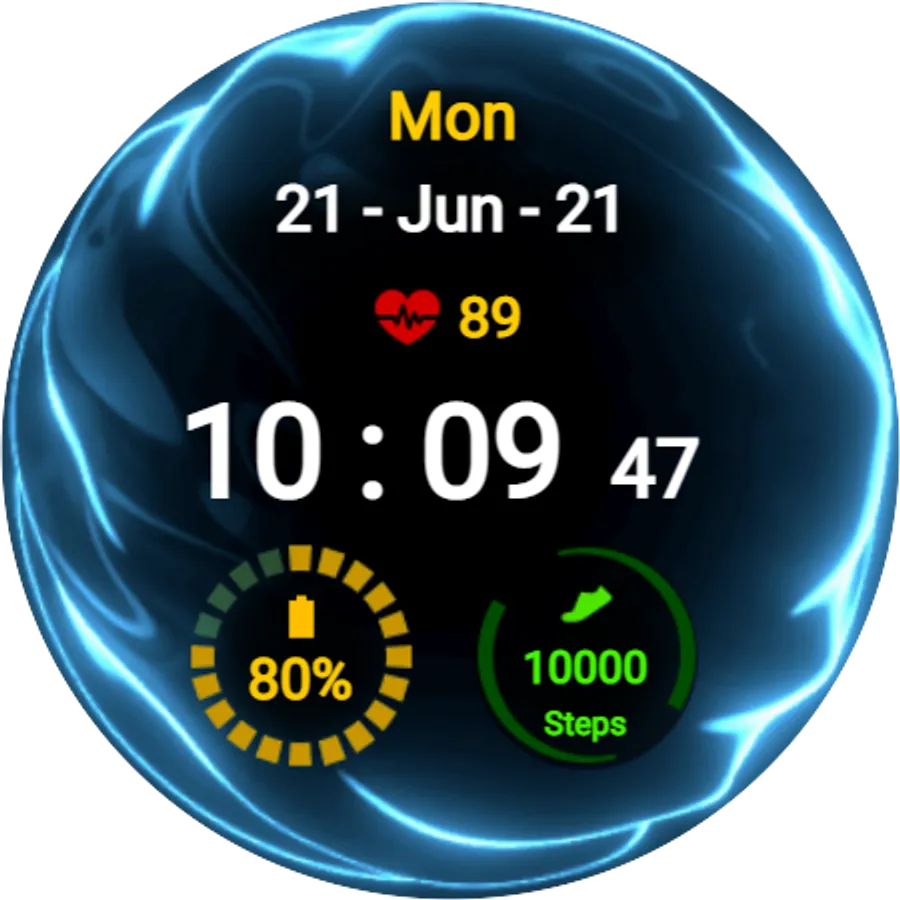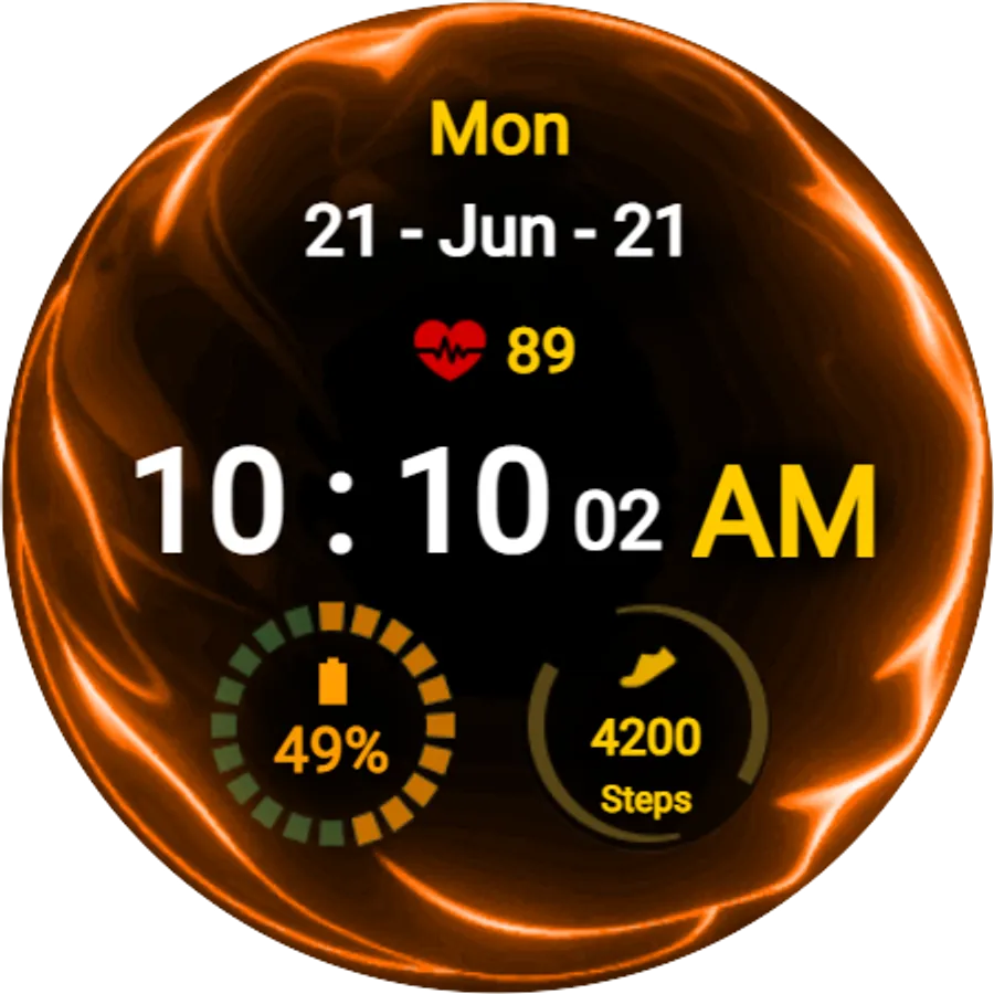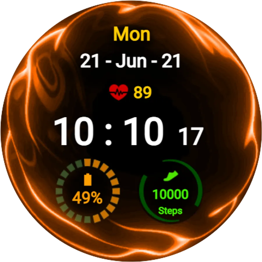 Simple digital watch face for Wear OS with animated fluid theme. With a glance at the watch face, you will be able to see the important information (The date, time, heart beat rate, number of steps, and battery percentage). The animated background creates a cool effect that will make you stand out from the others. Furthermore, the animated background color and the color of the battery indicator changes according to the battery percentage allowing you to immediately know where your battery level at without focusing on the details. Similarly, the number of steps will glow green when you reach your daily target. It supports always on display mode with 12- and 24-hour formats designed for Wear OS and designed for you.