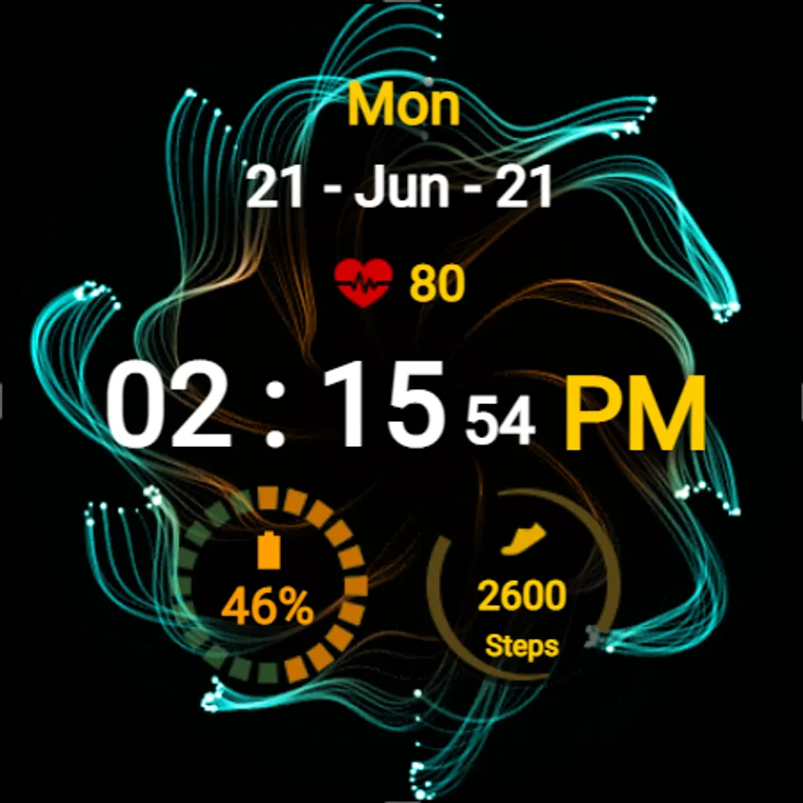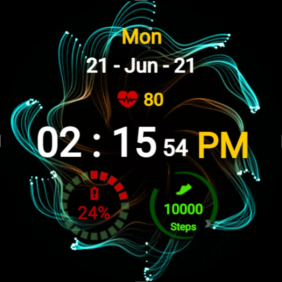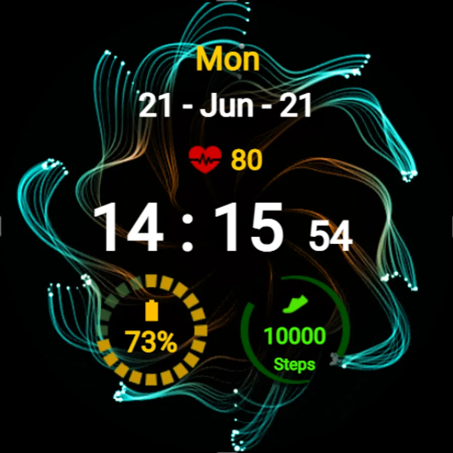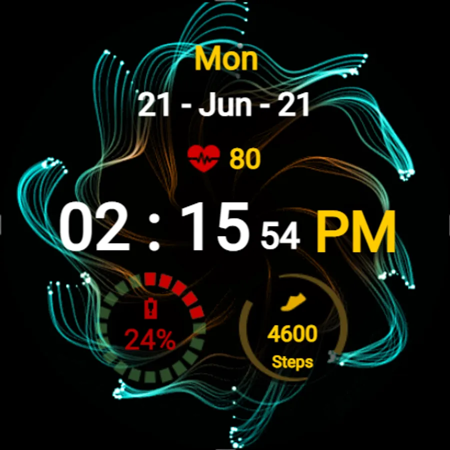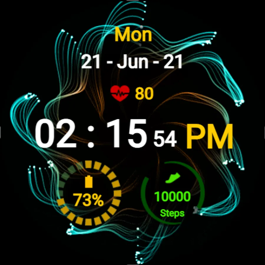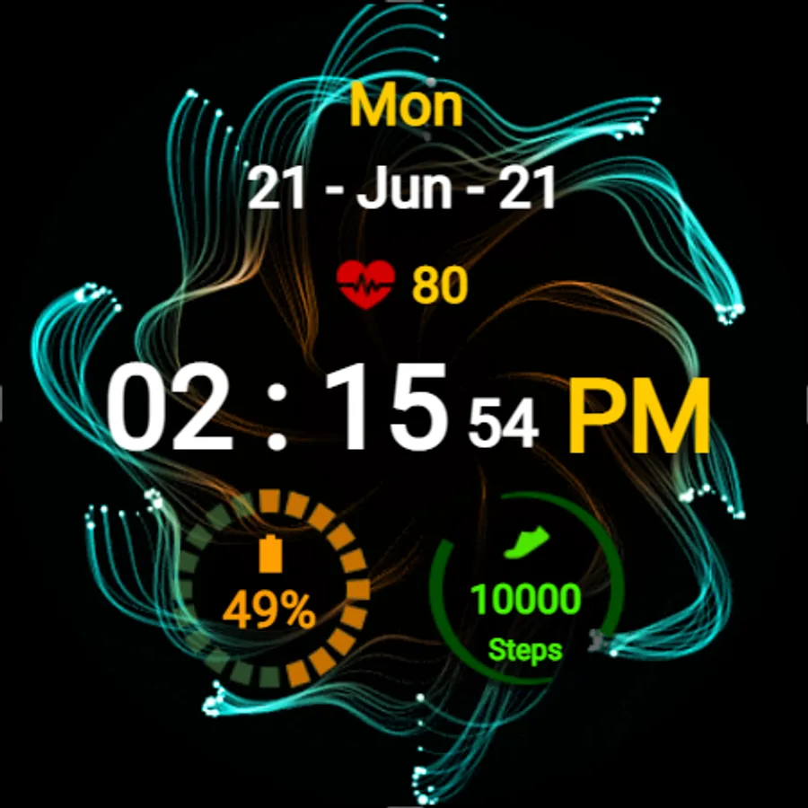 Animated, simple, beautiful, and glowing watch face. Be unique and special and capture the eyes of others around you with this animated spiral flower mixing soft orange and glowing green. This beautiful design allows you to shine without losing information that matters to you. With a simple glance at the watch, you will be able to see the time in 24h & 12h format, the date, your heart rate reading, your battery level, and the number of steps you have walked for that day. This watch face not only gives you the information but also helps you visually to immediately take decision and actions. With a battery indicator that changes the color from yellow to orange and then red depending on the battery level and a step count indicator that glows in green when you reach your goal. With always on display mode, this watch face is designed for you.