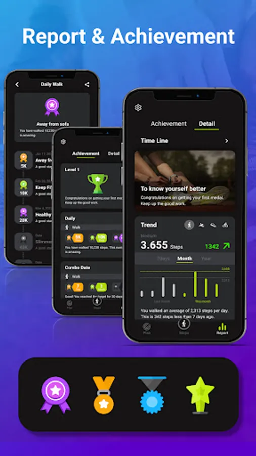 App can log your daily activity: Walk, Run, Bike, Swim, Drink Water and remind you if you forgot to practice!