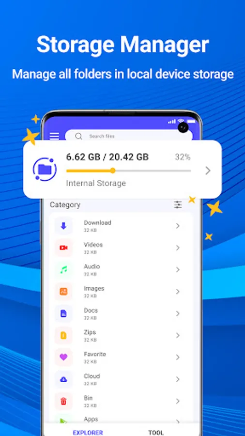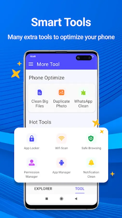 Not only browsing & view files you can access to many useful tools such as: Big File Cleaner, Photo Duplicate Finder, whatsapp Cleaner, App & Persmission Manager, File Transfer, App Lock & Secret File