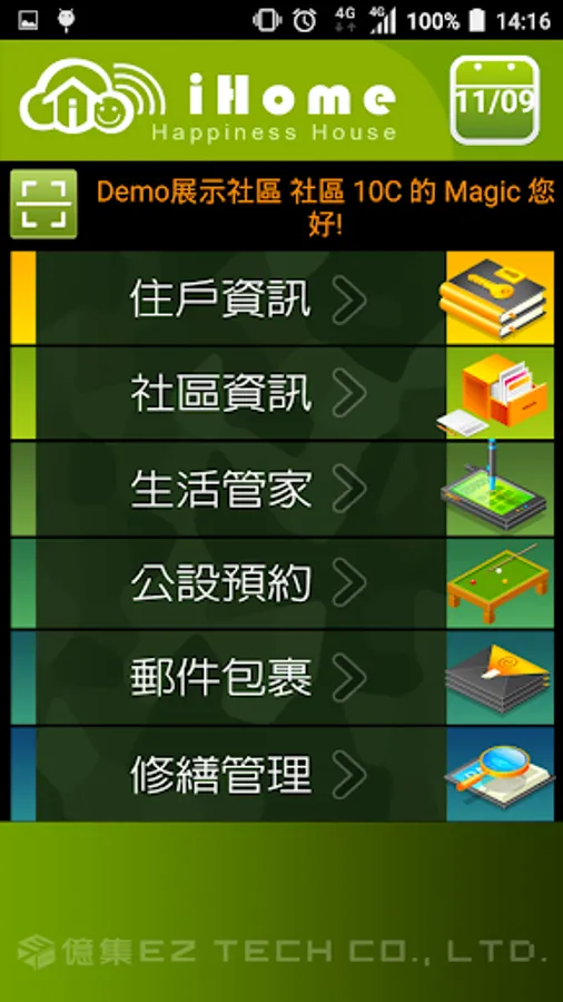 iHome住戶版包括住戶資訊、社區資訊、生活管家、郵件包裹、公設預約、修繕管理、資產管理等社區物業生活服務。