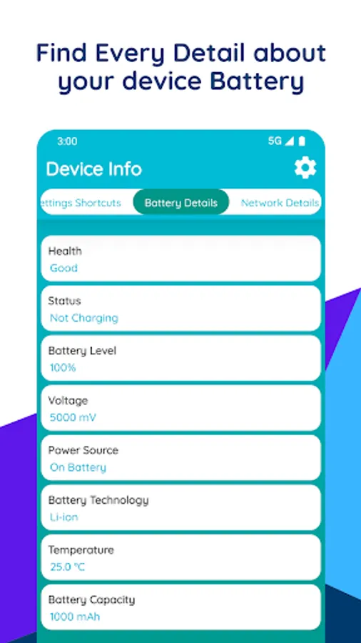 This page shows your Battery Health, Status, Level and Voltage, Power source, Technology, Temperature and Capacity.