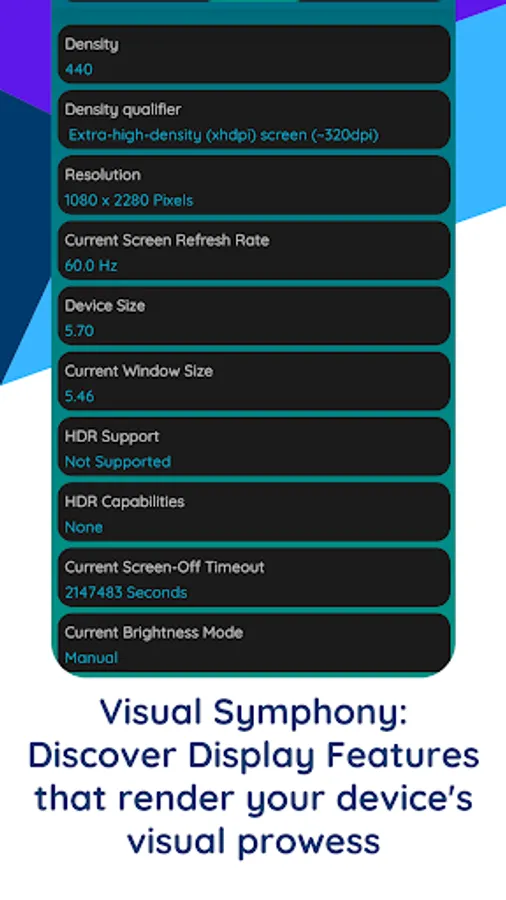 It shows details about the display of the device. It shows DPI of display, Resolution, Screen Refresh Rate, Device Physical and window sizes, HDR support and capabilities,