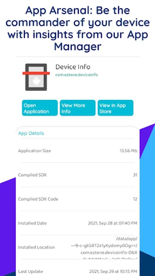 This feature shows details about pre-installed and user-installed apps. It shows features like app name and its package name, app size, compiled SDK code, installed date, last updated date, Target SDK, Minimum SDK, OpenGL ES version, version name and version code, and Certificate details like signing algorithm, version, validity period and Issuer and Subject details about each app. It also allows to see Permission used, Features, DEX class and manifest file of each app.