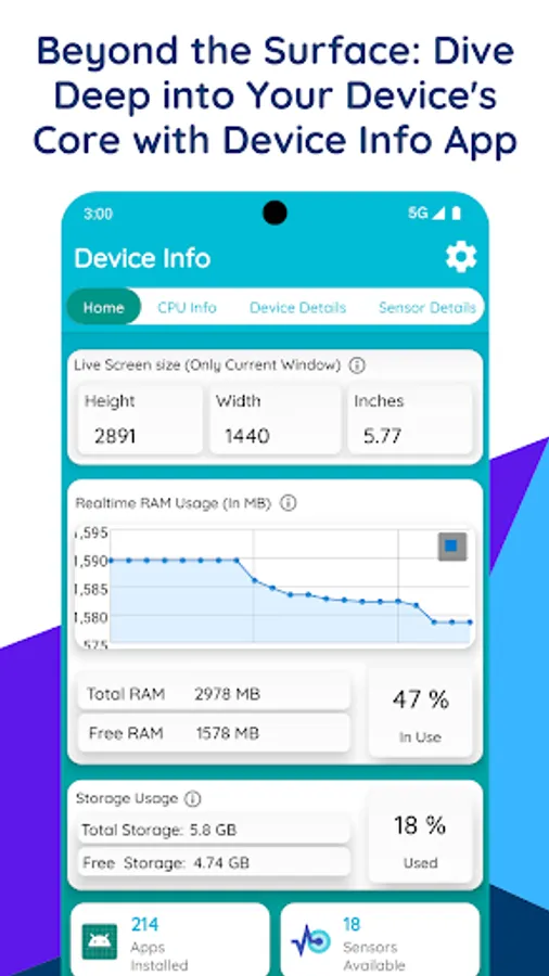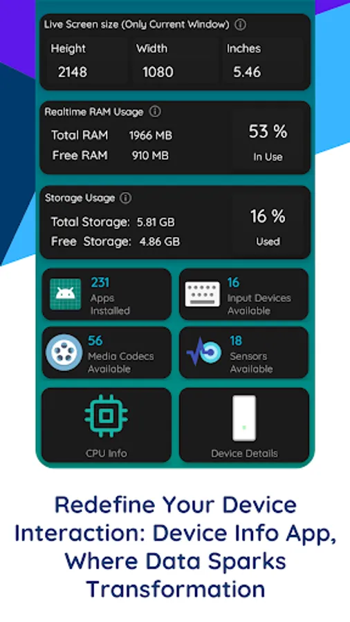 It shows your Processor name, CPU Hardware, ABIs, architecture, Processor Cores, CPU Governor, CPU type, CPU driver, CPU minimum and Maximum Frequency, Live running CPU list, CPU Usage Percentage, BogoMIPS, Vulcan Support, GPU Renderer, vendor and Version