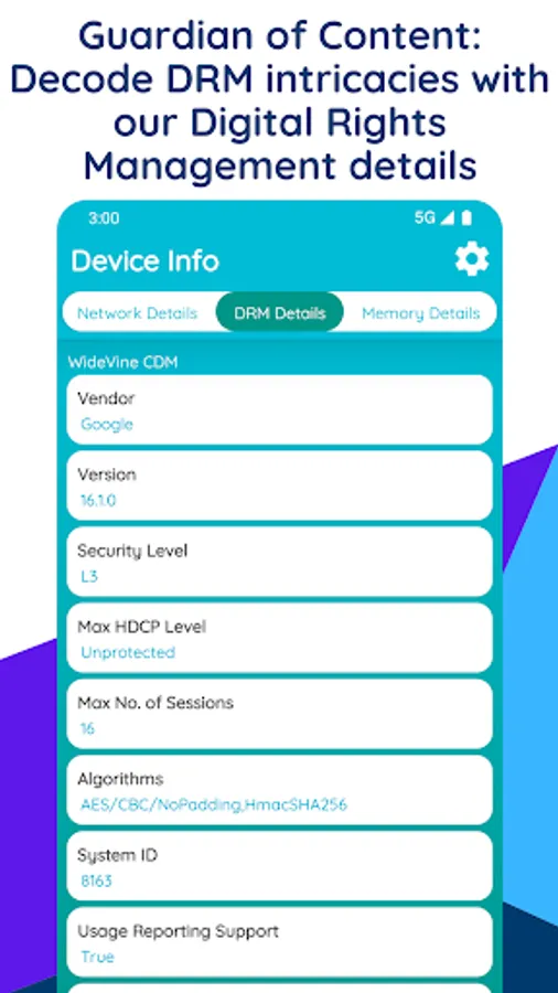 Details of Widevine CDM like its vendor, Version, Security level, Maximum HDCP level, number of Maximum sessions, Algorithms, System ID, Usage reporting support and HDCP level.