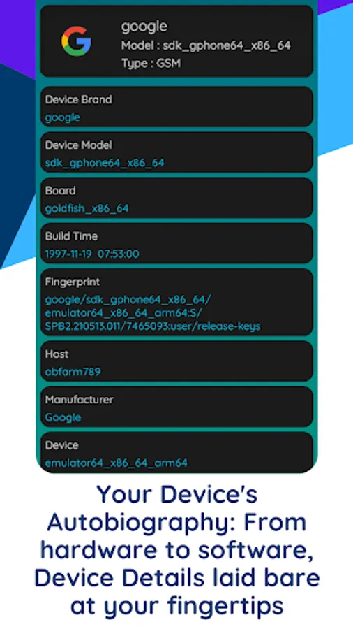 Device brand, Model, Board, Build Fingerprint, Manufacturer, Phone type, Time zone, Radio name and displaying name and many more.