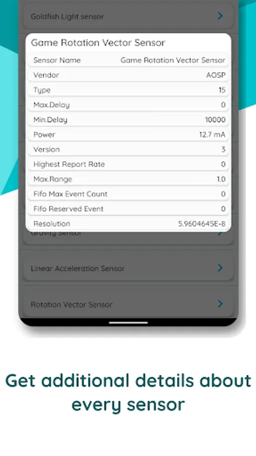 Sensor Data app helps you to access your Sensor details instantly. You can view all your sensors and read real time data from select sensors. Details like Sensor's Name, Vendor, Max & Min Delay, Power requirement, Version Resolution etc of every sensors are visible in All Sensors section. You can also add these sensor's shortcuts to home screen for easy access