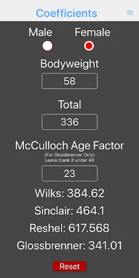 Calculate coefficients with IWF Robi, IPF, Wilks or Glossbrenner plus Sinclair and Reshel legacy formulas.