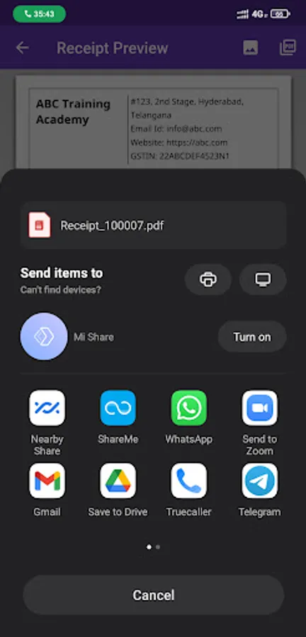 - Share receipt in Image/PDF format directly via WhatsApp, Telegram, Email, Gmail, Google Drive, Bluetooth, etc.